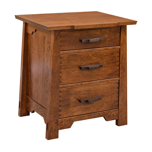 Every surface of this nightstand is gently smoothed and rounded to the touch without sharp corners or edges. This nightstand features a sealed conversion varnish that protects this piece from water, oil, alcohol and even nail polish. In addition, the drawers have English dovetail, and they sit on full-extension ball bearings that kindly and easily glide open and shut. These features give this nightstand not only a distinguished look but an elegant and prestigious feel as well. Furthermore, this stylish Amish Greene & Greene Pasadena Three-Drawer Nightstand is built to the highest standards and with the strictest attention to detail making it last you for generations. Availablein a variety of woods and finishes.