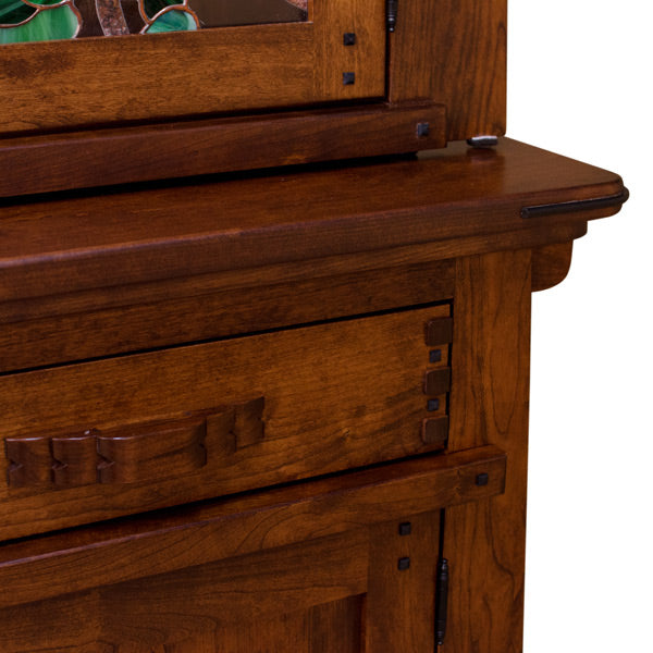 Note the heft and grace of the hutch and the truly detailed glass work. Truly a work of art, this China Hutch would be appropriate for a Mission or Craftsman motif room and would look wonderful in a Bungalow style or Prairie home.