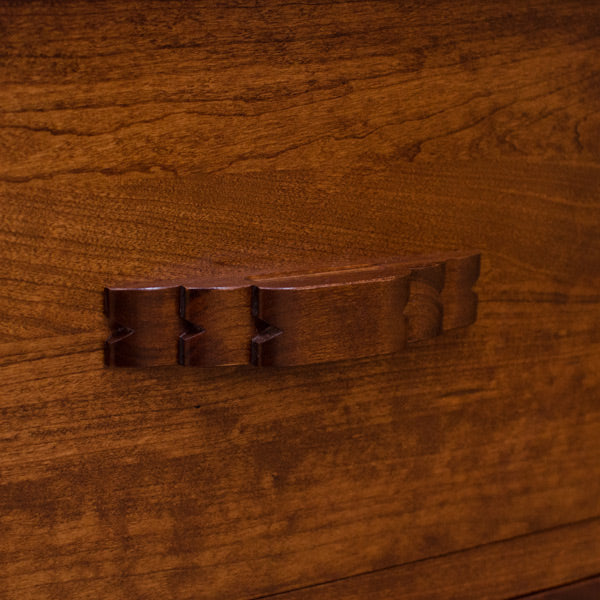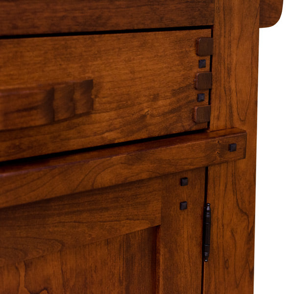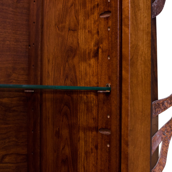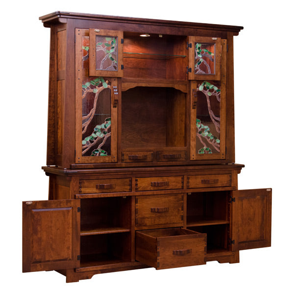 This unique Mission or Arts & Crafts Greene & Greene China Hutch w/ Tree of Life Glass, with its intricate Wood Joinery, is typical of that seen in the Gamble House of Pasadena, California, a hallmark of the Greene and Greene contributions to the Arts & Crafts movement. Every surface is smoothed and rounded, gentle to the touch and without sharp corners or edges