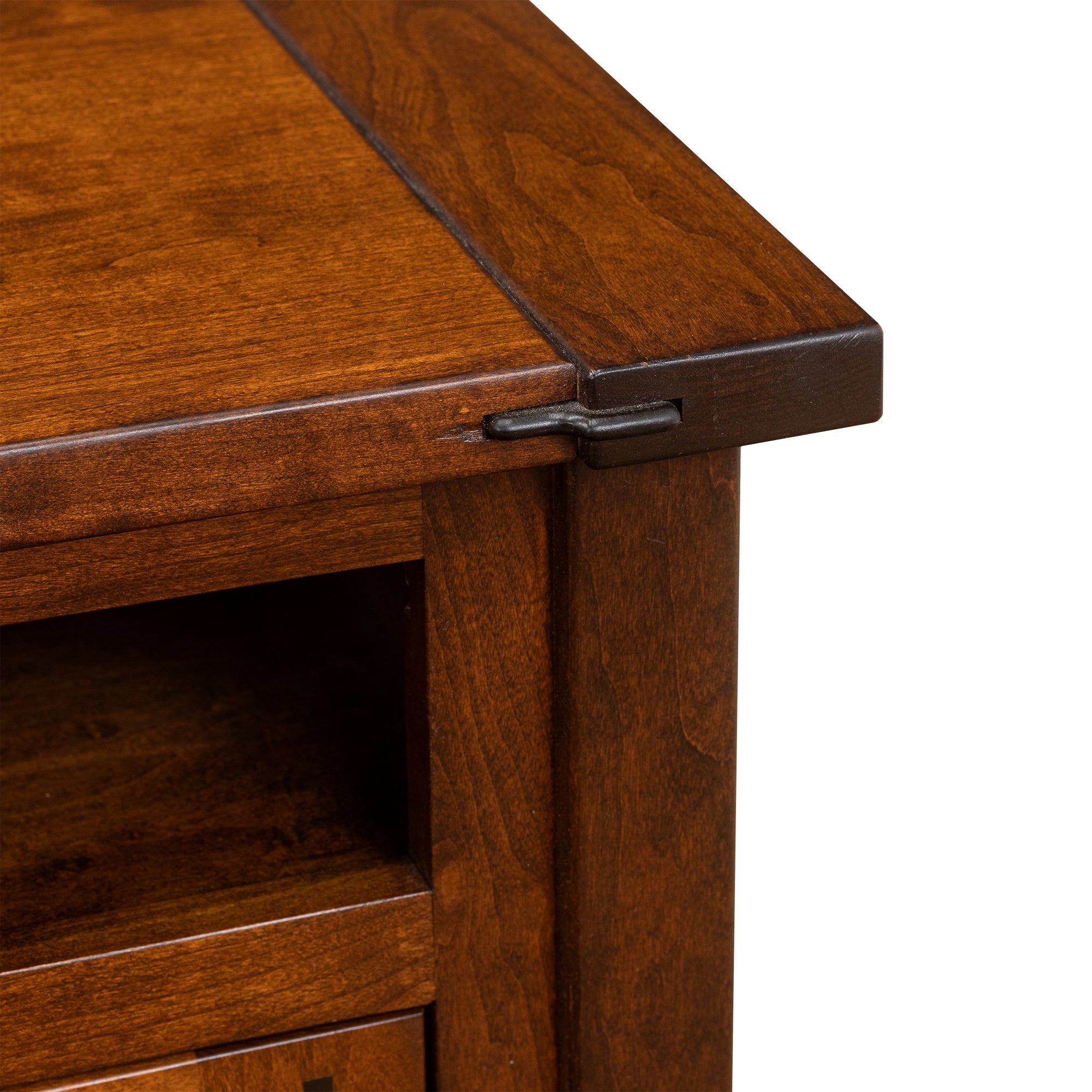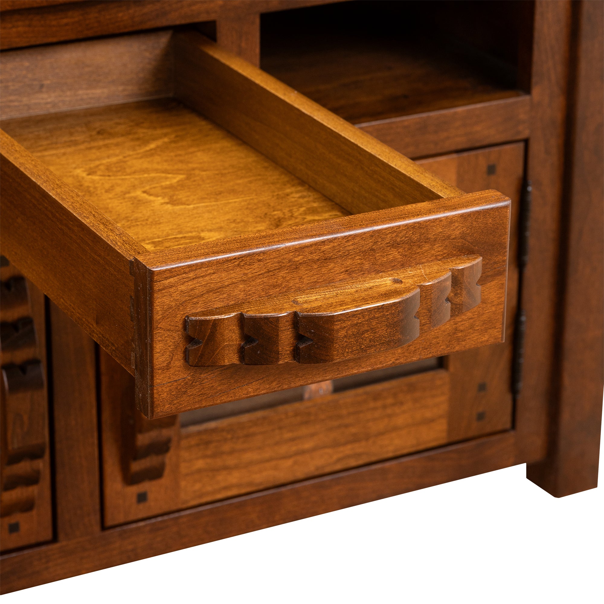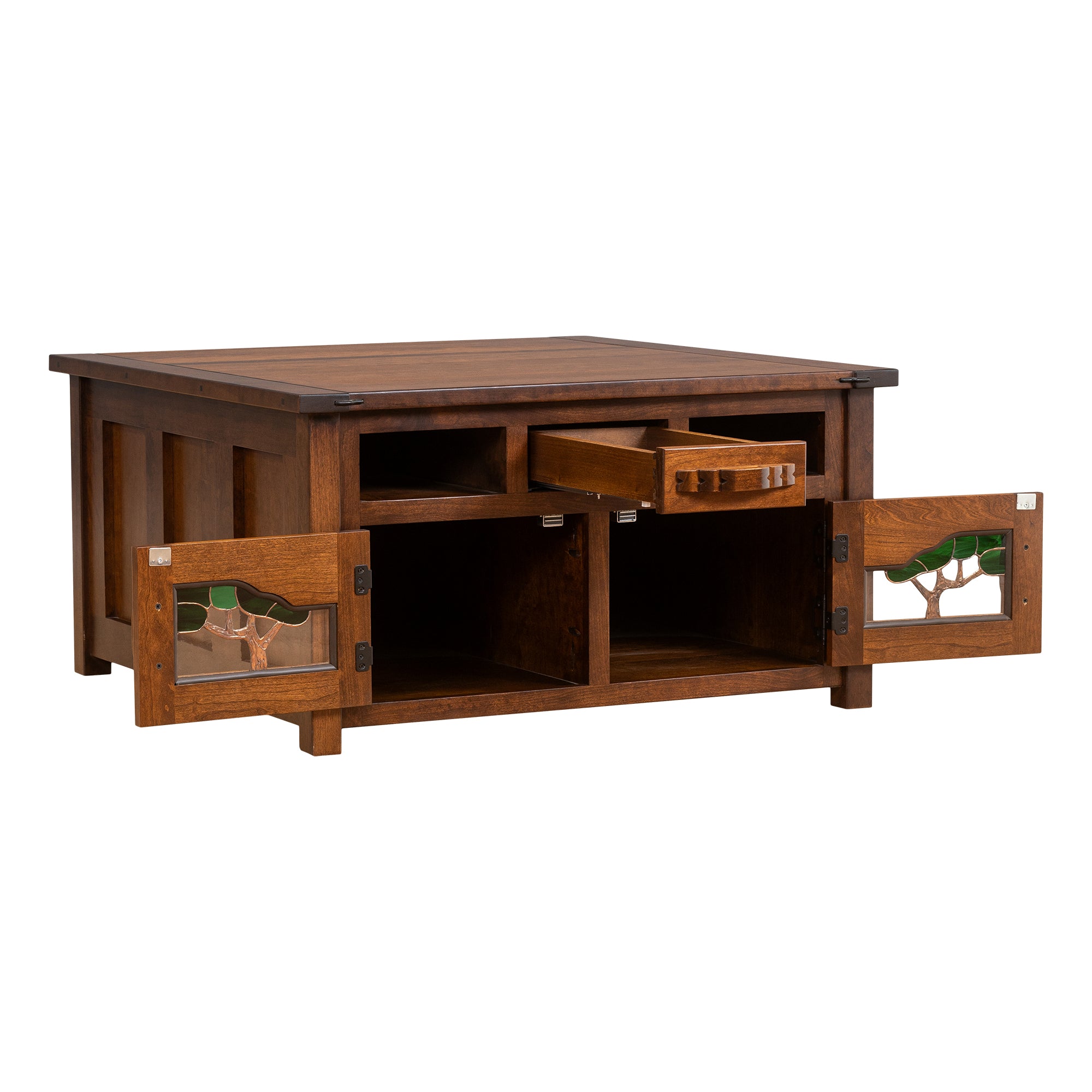 Admire the beautiful look of this solid Cherry wood coffee table with a dashing finish of the OCS 113 stain to complete its exquisite look. This unit is shown without a handle in the drawer. The drawer sits on a full extension glide.