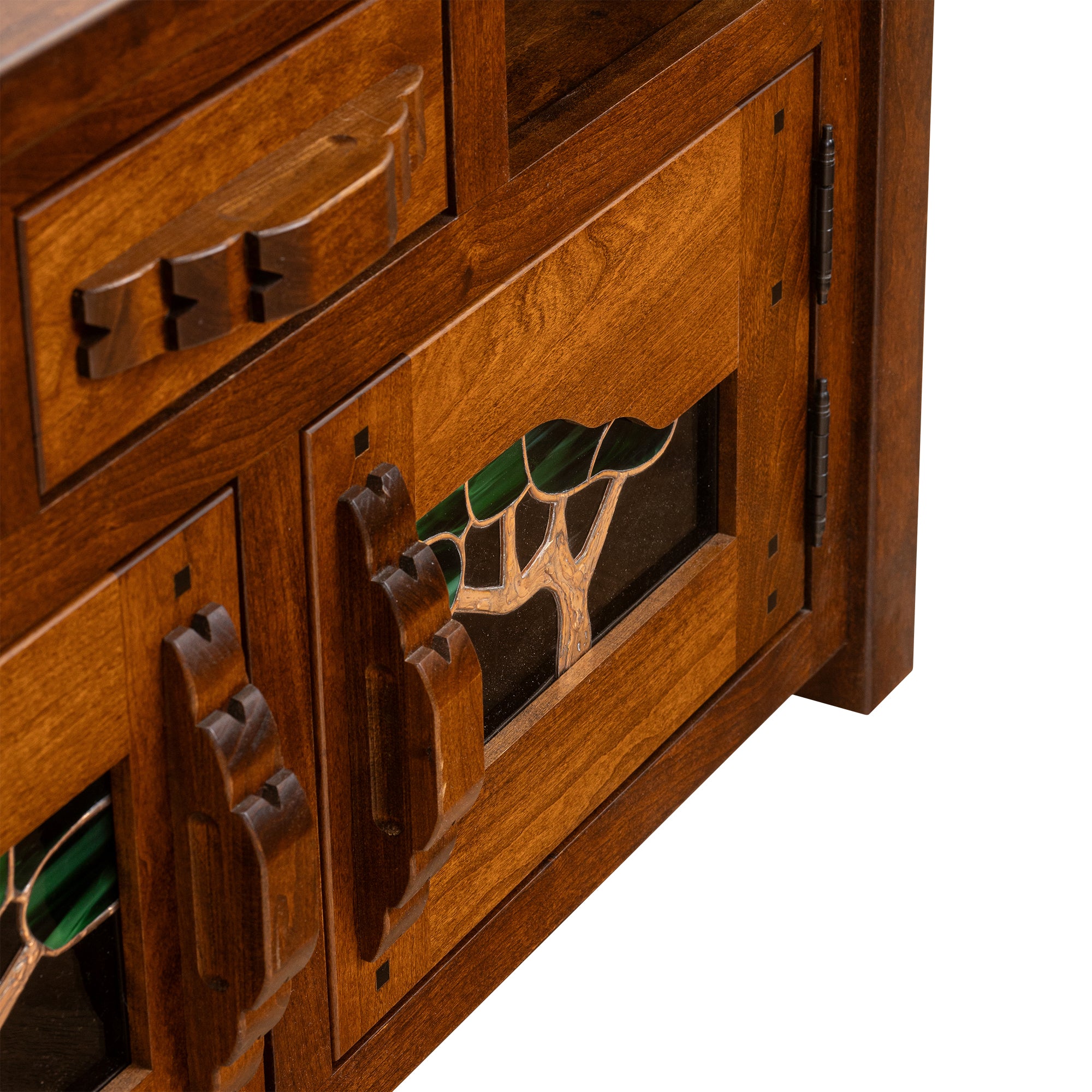 The 36" Greene & Greene Coffee Table is an elegant piece designed with the characteristics made popular by architects Greene and Greene. This coffee table features smooth, rounded surfaces and exquisite details. This elegant piece is constructed out of solid Cherry and with black square insets.