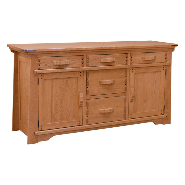 This pulchritudinous 70" Amish Greene & Greene Server is hand made by the Amish Craftsman and is made with solid Pennsylvania Cherry wood and beautifully place ebony insets. The elaborate woodwork of this piece is typical of that seen in the Gamble House of Pasadena, California. This classic and timeless server is a hallmark of the contributions to the Arts & Crafts movement.