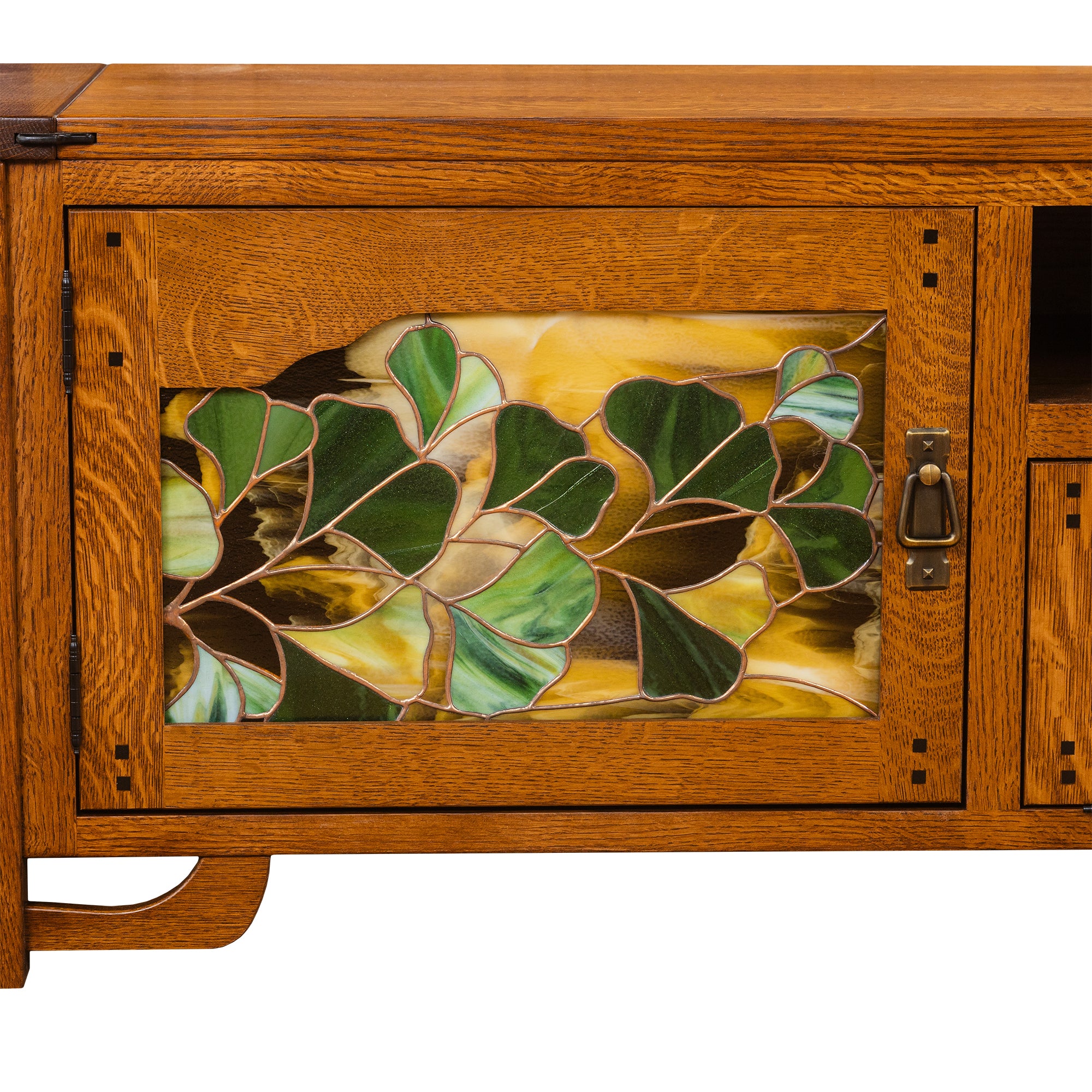 This absolutely gorgeous Greene & Greene TV stand is something to behold. It?s stunningly beautiful that is made by Amish craftsman with honed expertise in building furniture. As shown, it is made out of solid Cherry wood that is individually hand picked to build this TV Stand. In addition, it is adorn with ebony splines and the glass with the famous Tree of Life. This detail is indicative of the Greene & Greene style. Even without the familiarity of this style, you can still appreciate and admire this lovely piece of furniture in your living room.