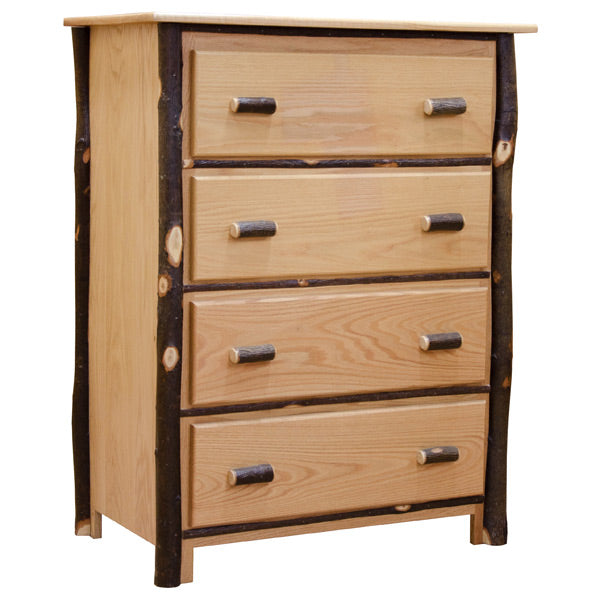 This Plain Cut Oak/Hickory Four-Drawer Chest is skillfully constructed by highly experienced Amish Craftsmen. This Chest is exceptionally unique not only because of its genuine antique design, but because it is made from the hardest of all North American Harwood. The legs on this chest and the pulls of the drawers are constructed from the suckers of Hickory trees - a material that is harvested limitedly in certain seasons.