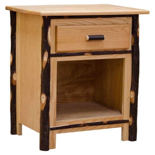 This Red Oak/Hickory One Drawer Nightstand with Opening is exceptionally unique not only because of its genuine antique design, but because it is made from the hardest of all North American Hardwood. In addition, this Nightstand is skillfully constructed by highly experienced Amish Craftsmen using solid Quarter Sawn Natural Oak (shown). Furthermore, the legs on this Hickory Nightstand are constructed from the suckers of Hickory trees-a material that is harvested limitedly in certain seasons.