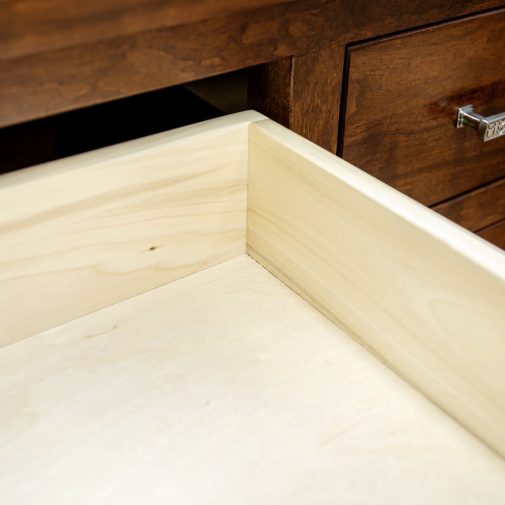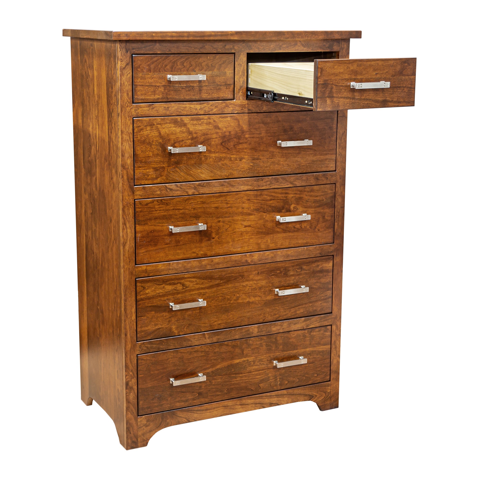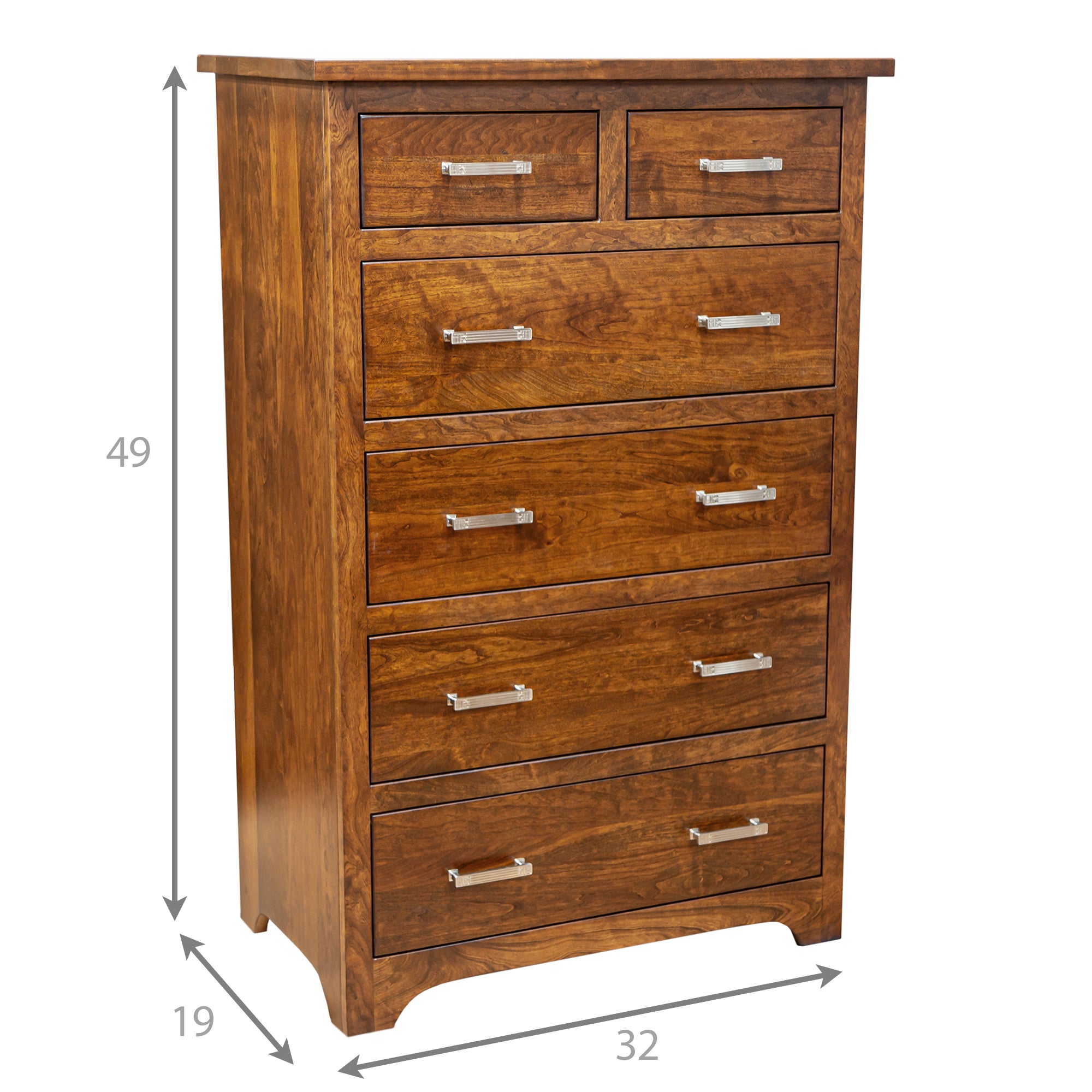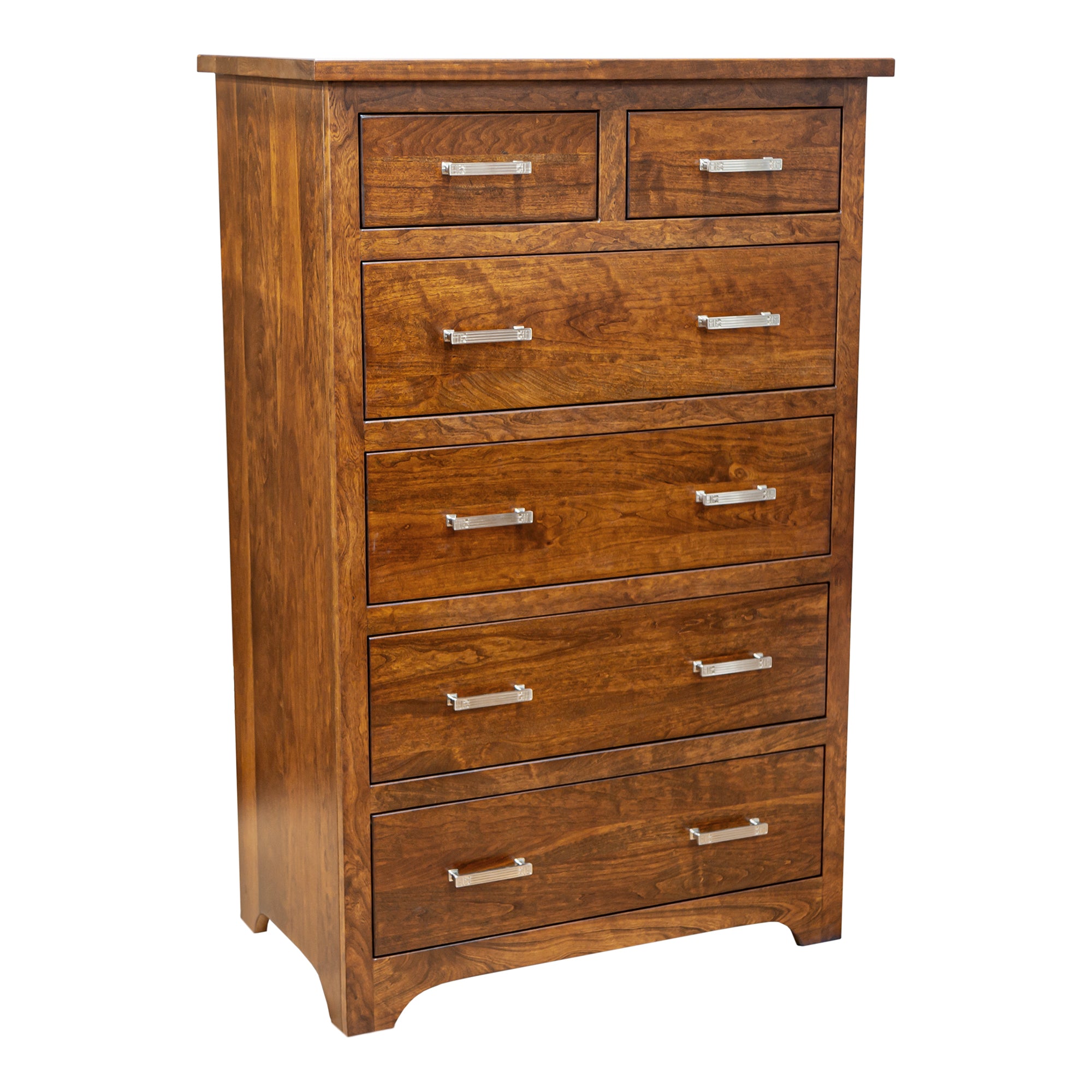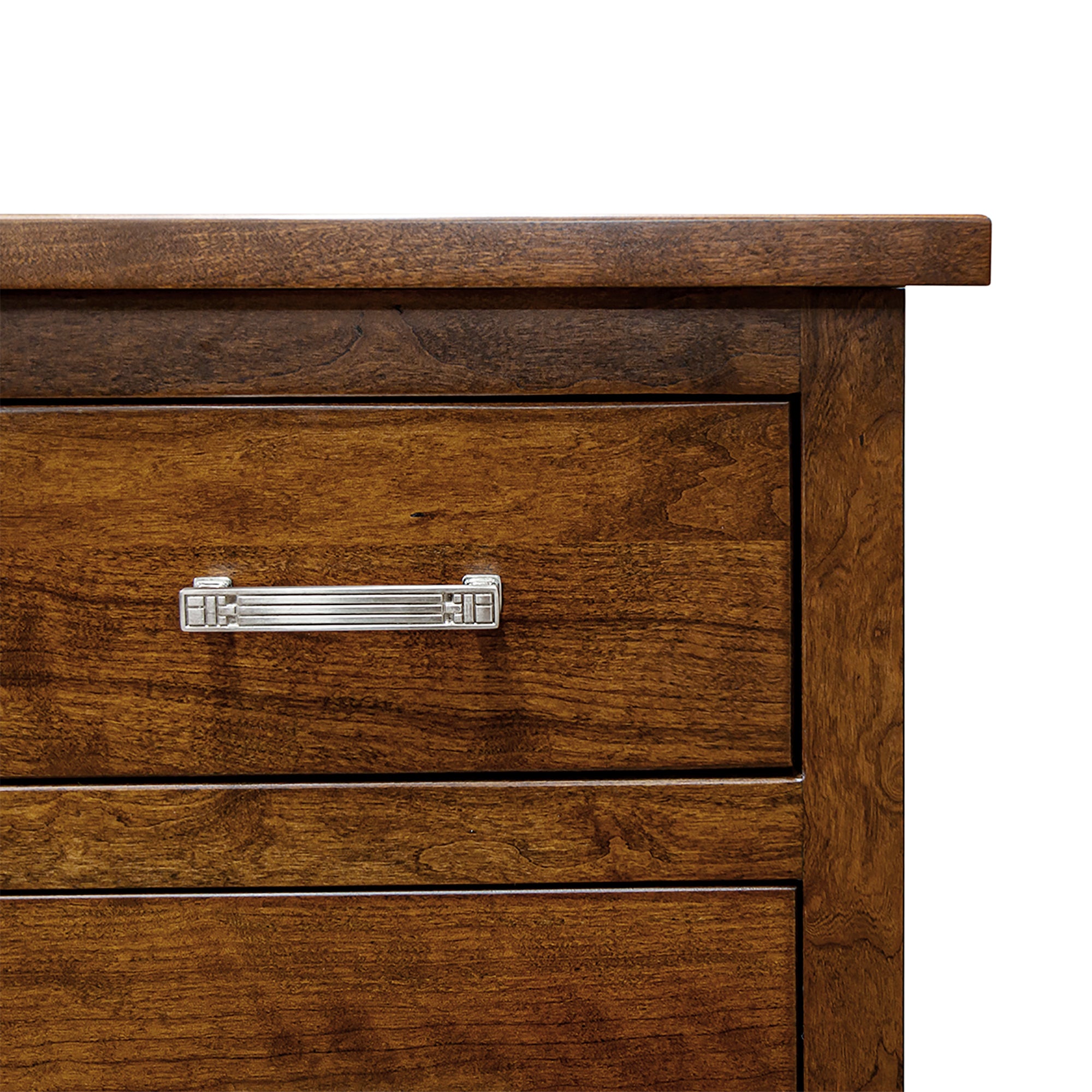 Our distinctive Kentucky Shaker (Our Designer) series of dressers and chests have a hint of "Arts and Crafts" and yet "Mid Century" details and materials. Shown here is Solid Character Cherry Wood. This series is also available in all Walnut, Maple and Plain Cut Oak and in any finish color. Note distinctive brushed nickel hardware.