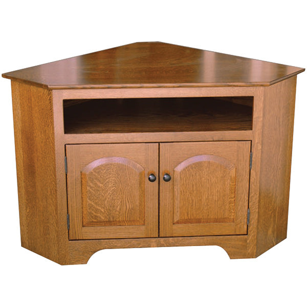 This unique, custom-made corner television stand fits easily into the corner of your living room or den, and is ideal for smaller spaces. The Knob View Shaker Corner TV Stand features a cabinet with two doors that have pretty, arched beveled details, and a large upper shelf perfect for housing a cable box or media player. This Amish-made television stand measures 44" wide by 27" deep by 28" high, and is part of a line of Knob View Shaker furniture from Barn Furniture. This easy, American-made TV stand is available in a range of woods and finishes to meet your design needs, including oak, hickory, cherry, and maple (show in red oak). Like all of the solid wood furniture from Barn Furniture Mart, this manageable corner TV stand is stain and water resistant, is made in the USA, and comes with a satisfaction guarantee.