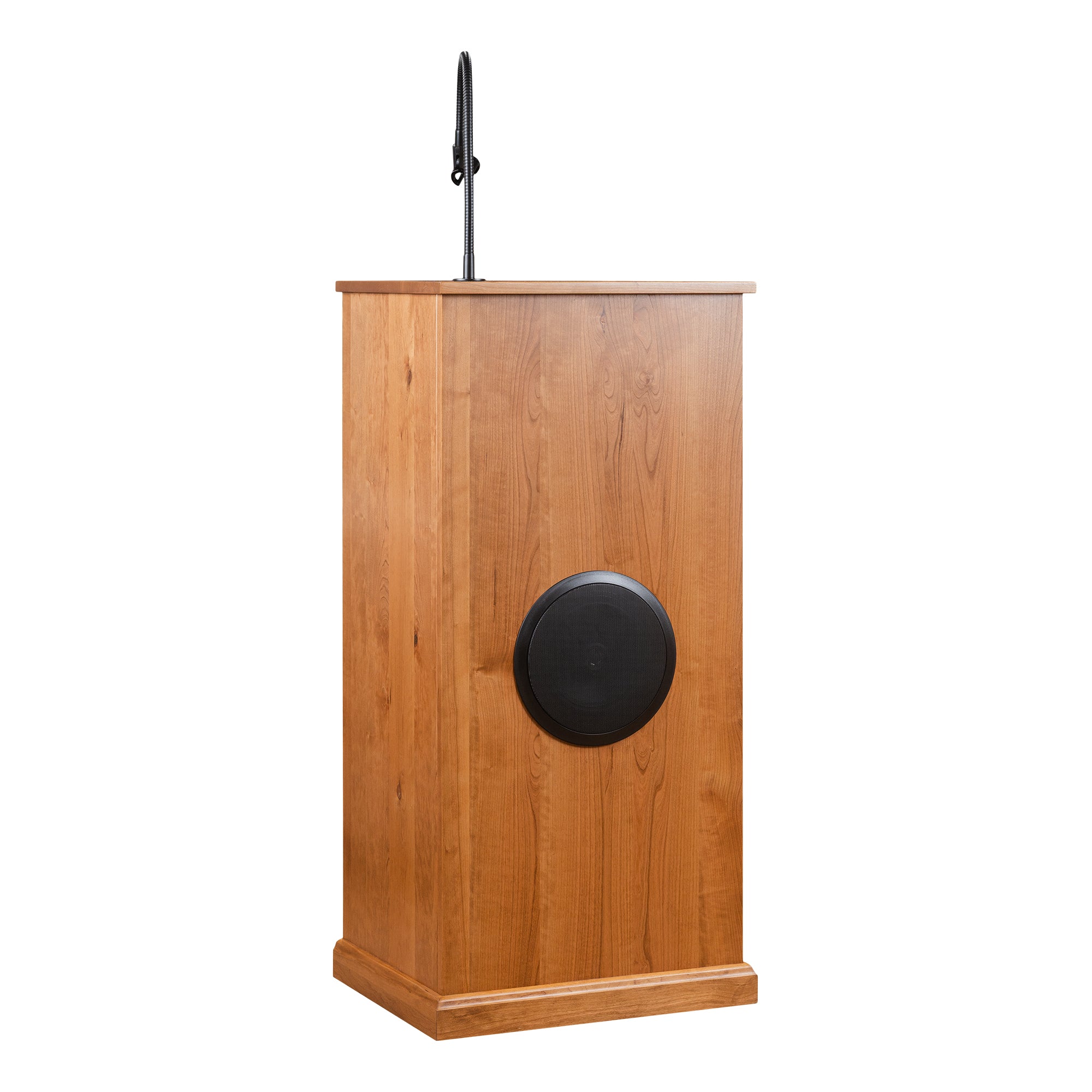 Solid Wood Host Stand with Mic Holder and Speaker – Crafted from durable solid wood, this elegant host stand offers both style and functionality. Features include a built-in microphone holder, speaker system, open shelf for quick access, and cabinet storage below. Perfect for restaurants, event spaces, or presentations.