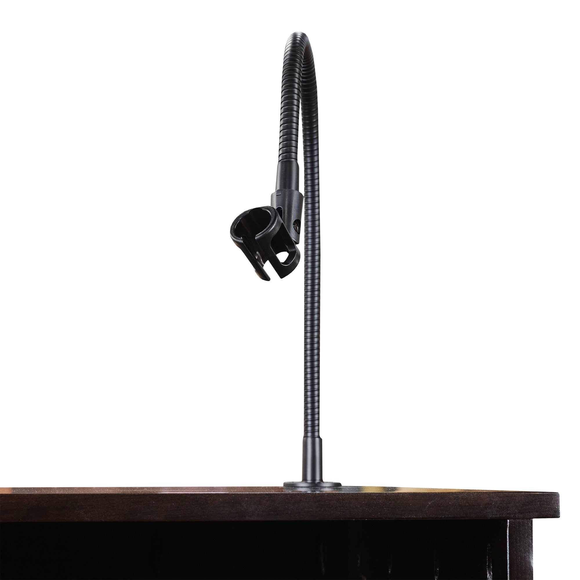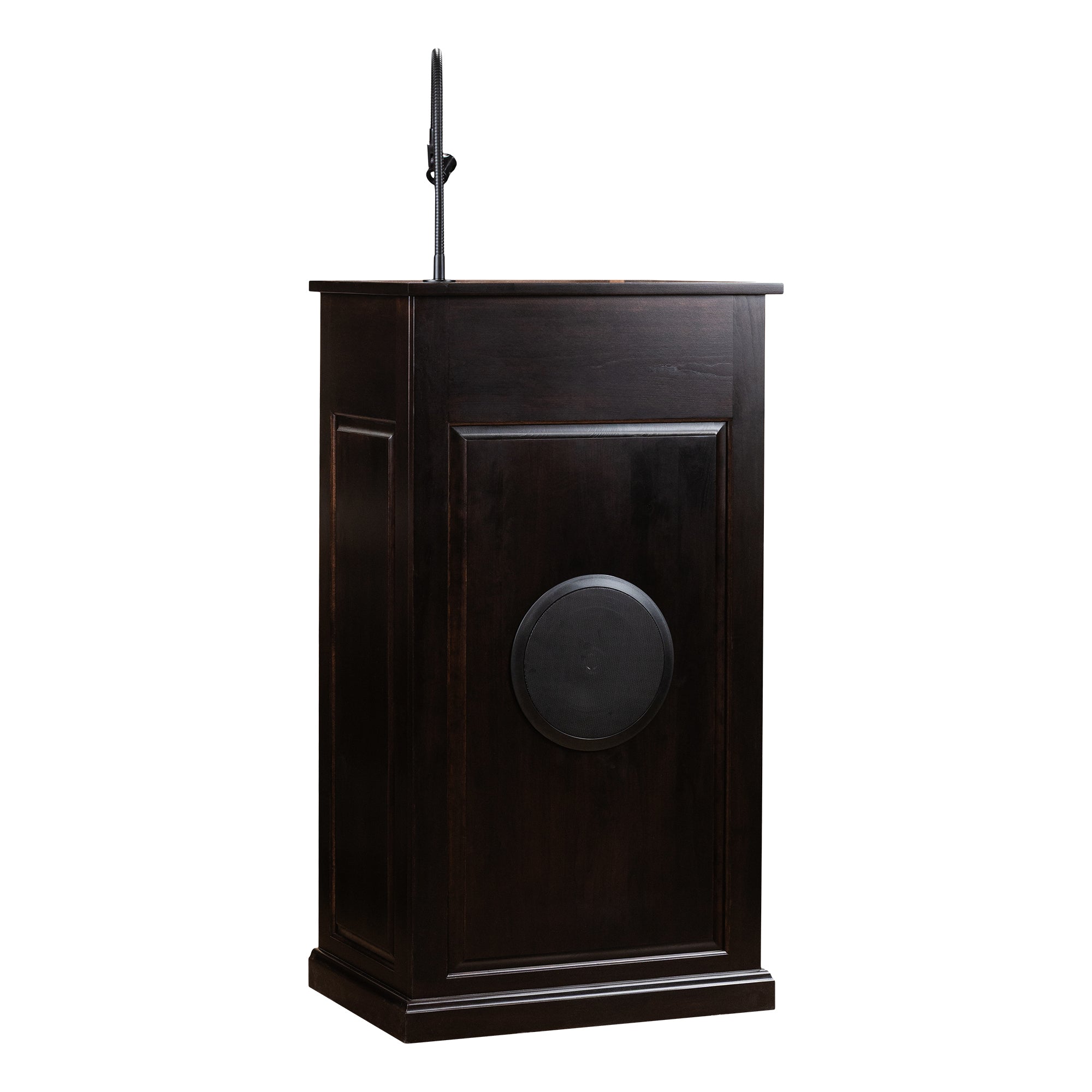 Amish Crafted Solid Wood FurnitureSolid Wood Host Stand with Mic Holder and Speaker – Crafted from durable solid wood, this elegant host stand offers both style and functionality. Features include a built-in microphone holder, speaker system, open shelf for quick access, and cabinet storage below. Perfect for restaurants, event spaces, or presentations.