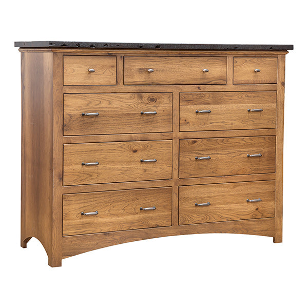 This Lewiston Collection is Classic Amish American Hand Made in a Rustic Contemporary Design. Drawers are EnglishDove Tailed front and back and we use solid hardwood drawer boxes and cases throughout. Drawer suspension is Side Mount Full Extension ball bearing slides. Custom sizes and details are always available options as well as matching beds in all sizes with and without under drawers. We have it shown here: Base is in an OCS110 on Solid Rustic Hickory and Top is in Ashberry on Reclaimed Barn Wood. We have hundreds of finishes and many wood species to choose from. Toll Free: 888-302-2276