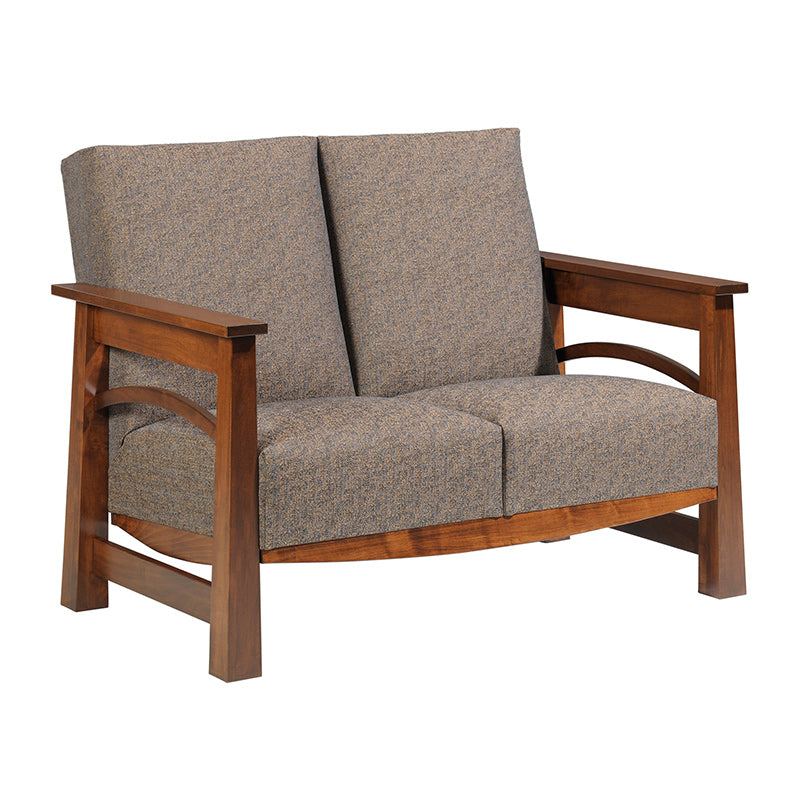 Easy style is all yours with the Madison Love Seat, part of an entire line of modern, American-made furniture from Barn Furniture! This handsome, custom-made loveseat has a clean wooden structure with comfortable cushion seating, and is available in several woods, finishes, and fabric options sure to match your style and décor. The structure of the Madison Love Seat offers lovely curves and clean lines, and measures at 35 1/4" deep by 50" wide by 39 1/2" high, making it ideal for a living room or den. This Amish-made love seat is a fitting addition to the Madison collection, which includes a bench, chairs, ottomans, storage chests, TV console, tables and more! This Barn Furniture product is water and stain resistant, made in the USA, and like all of our products, we guarantee it will be a wonderful addition to your home