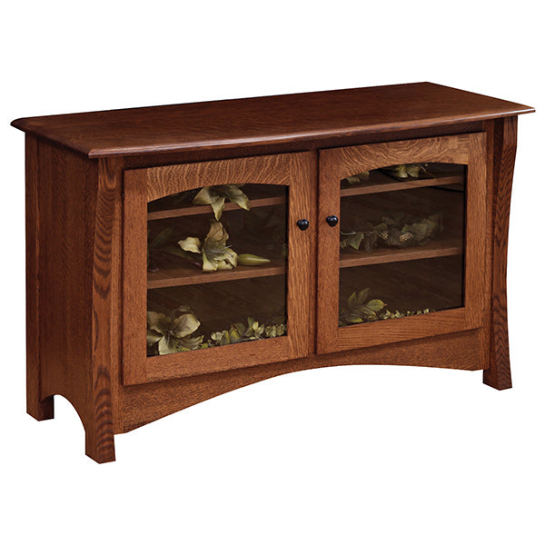 This classic televisions stand will make a fantastic addition to your den, family room, or bedroom, and features lovely glass inset doors and curved detailing at the bottom of the unit. This Master TV Stand has plenty of interior shelves for displaying pictures, storing media, or showing off mementoes, and the 50" top can accommodate a large, flat-screen television. The Amish-made television stand measures 30" high by 50" wide by 20" deep, and is one in a series of TV stands with various features and sizes to meet your design needs. This traditional, custom-made Master TV Stand comes in an array of finishes and woods options, including red oak, rustic cherry, quartersawn white oak, brown maple (pictured), and more. Like all of the solid wood furniture from Barn Furniture Mart, this handsome television stand is made in the USA, is water and stain resistant.