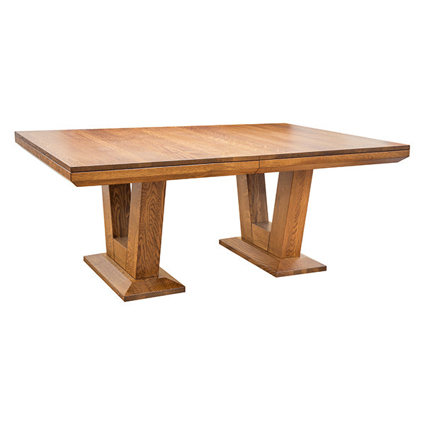 The exclusive, custom-made Mckay Dining Table features a modern, structural design that is sure to impress. This solid, North American hardwood table includes two oversized, v-shaped legs that sit on solid, rectangular feet that hold up a smooth tabletop with unique, beveled edges on the underside. This Amish-crafted dining table also expands for additional seating, and measures a full 30" high by 42" wide by 72" deep, ideal for casual dinner parties or formal, holiday meals. This contemporary, American-made table comes in a range of woods and finishes to meet your design needs, including oak, maple, and cherry. The handmade Mckay Dining Table is one of many dining room furniture pieces from Barn Furniture Mart, which includes dining sets, chairs, hutches, and more. Like all of our solid hardwood furniture, this handsome dining table is crafted to be stain and water resistant, is made in the USA, and is guaranteed to add value to your dining space!