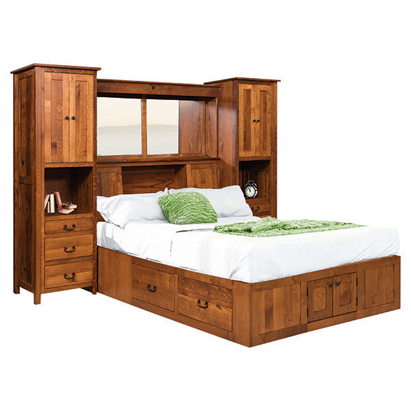 This Mission, Arts and Crafts Pier Wall Bed is part of our extensive Collection of coordinated Bedroom Classics. Amish American Hand Made Drawers are English Dove Tailed front and back and we use solid hardwood drawer boxes and cases throughout. Drawer suspension is Side Mount Full Extension ball bearing slides. Custom sizes and details are always available options as well as matching beds in all sizes with and without under drawers. Additional items often stocked are night stands, dressers, chests and Armoires in this classic design. We have it shown here in an OCS 113 stains and crafted in Character Quarter Sawn White Oak. We have a variety of finishes and many wood species to choose from. Toll Free: 888-302-2276