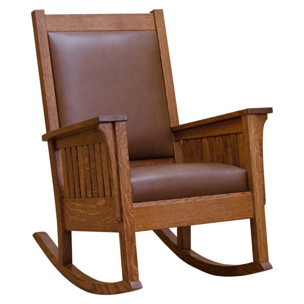 This beautiful Mission Amish Rocking Chair is built to the standards exemplified by the Arts & Crafts Movement. Handcrafted by highly experienced Amish furniture makers in the Heartland of America, this rocker is constructed from solid quarter sawn Northern White Oak (shown) and features a smooth silky finish. It is upholstered in leather and can be custom made in a variety of fabrics, leathers, woods and finishes.
