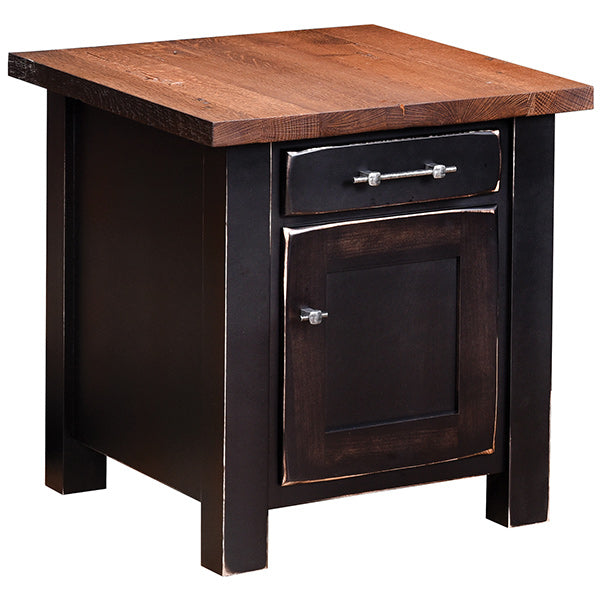 This handsome Reclaimed End Table provides a lovely, rustic design with two tones of reclaimed wood, ideal for any modern farmhouse or chic country d?cor. Measuring 24" high by 22" wide by 24" deep, this Amish-made end table has a single drawer and cabinet for storage, complete with charming metal pulls, and hand-hewn details on the wood. Part of a series of reclaimed wood pieces, this end table is a perfect complement to the Reclaimed Barn Wood Coffee Table or the Reclaimed Barn Wood TV Stand. This unique, handmade table is available in a variety of wood and finish options to suit your style, including brown maple (shown), red oak, rustic cherry, quartersawn white oak, and more. Like all of our solid wood furniture, this Reclaimed End Table is crafted to be water and stain resistant, and is made in the USA.