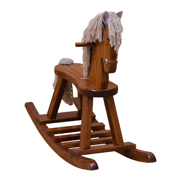 This beautiful, small, and sturdy Child?s Rocking Horse is handmade skillfully in the United States by Amish Craftsmen. This sturdy solid Red Oak rocking horse makes a perfect addition to any child?s playroom or bedroom. It features thread hair on top and a thread tail making it a stylish yet pleasant rocking horse for your child. This quality construction of sturdy solid oak insures that this rocking horse will not only be a child?s favorite today, but that it will also last for generations.