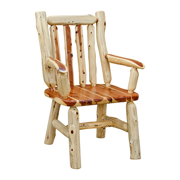 Our Rustic Red Cedar dining series is a real eye catcher. Red Cedar has a characteristic of stark contrast between the sap wood (light color to beige) to bright red in the heart of the tree. Note the stripe in the arm when shaped flat exposing the interior of the whole pole. This is a robust design available in all coordinating items including side chairs, bar stools, bars, and dining tables with and without stump bases, china cabinets or even kitchen cabinets. We are unlimited in what we can build for you!