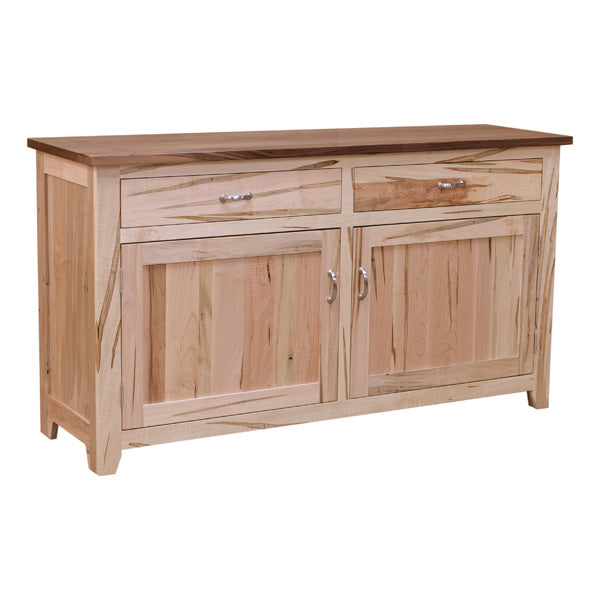 This two tone Shaker Server is lovely with an eye catching color contrast that will leave an impression of amazement. Its top is made with the solid Walnut that shows variations on the grain pattern that similarly compliment the wormy maple with its unique unpredictable pattern. The unit is in the natural finish to exhibits its refined elegance.