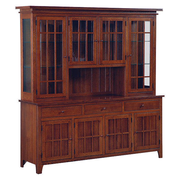 The Spruce Creek 4-Door Hutch Top with Buffet is an impressive piece for any dining room, with a traditional look and windowpane details that will add value to any home. Measuring 81" wide by 21" deep by 82" high, this custom-made china cabinet features a four, glass paneled doors for displaying your best china, or heirloom pieces. The solid, Amish-crafted buffet omes with a trio of drawers for flatware and linens as well as two sets of cabinets for storing larger items. This beautiful, American-made hutch and buffet also offers a large serving ideal for formal dinner parties. This substantial hutch is available in an array of woods and finishes, including oak, cherry, and maple to suit any color scheme or décor. Like all of the solid wood furniture from Barn Furniture Mart, this handsome china cabinet is water and stain resistant, is made in the USA, and comes with a satisfaction guarantee.