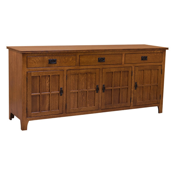 This exquisite piece Spruce Server is a masterpiece that compliments your Dining room. Its clean lines and standard black mission style hand is indicative of the Mission Style theme. This beautiful unit offers plenty of storage. And lastly, the drawers have full extension glides with dovetail joints that guarantee to last for a lifetime.