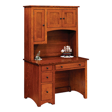 The popular handmade Student Desk With Hutch has everything a student needs for studying and working on homework. This handsome desk features soft curves and plenty of drawers for storage of projects and school supplies. The additional custom-made hutch allows for further storage, and is a great fit for any bedroom or dorm room. A great sister piece to the Student Desk from Barn Furniture, the Amish-made Student Desk With Hutch measures a full 71 1/2" high by 45 1/2" wide by 26" deep. This practical, American-made desk comes in a range of finishes and wood options to suit your taste, including quartersawn white oak (as pictured), rustic cherry, brown maple, and more! Like all of our solid wood furniture, the Student Desk With Hutch is made in the USA, and is crafted to be stain and water resistant.