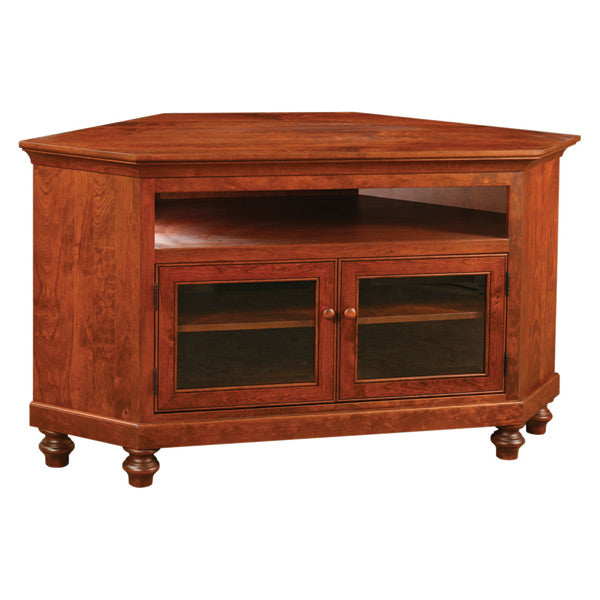 The center open section is a great feature for your DVD player/Cable Box or other electrical components. The shelf will accommodate other electronic devices. Admire its beautiful detailed bun feet of this unit. This Mission Corner TV stand is perfect for maximizing the use of a corner. No particle board or veneer on this unit.