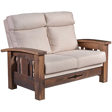 The Tiverton Love Seat is part of a collection of Tiverton solid wood furniture from Barn furniture that offers rustic style and comfortable seating suitable for any den or living room. This handsome, Amish-crafted love seat features soft curves and slatted design in the frame, which is available in oak, maple, cherry, and barn wood (as pictured) and measures measures 54" wide by 35" deep by 41" high. The cozy cushions offer seating for two—or one—and are offered in an array of fabric choices to fit in with any décor or color scheme. This lovely, American-made love seat matches the Tiverton Sofa, and also pairs well with the ottoman, tables, and recliners in the line. As with all of the solid wood furniture from Barn Furniture Mart, this elegant love seat is made in the USA, is designed to be stain and water resistant, and comes with a satisfaction guarantee!