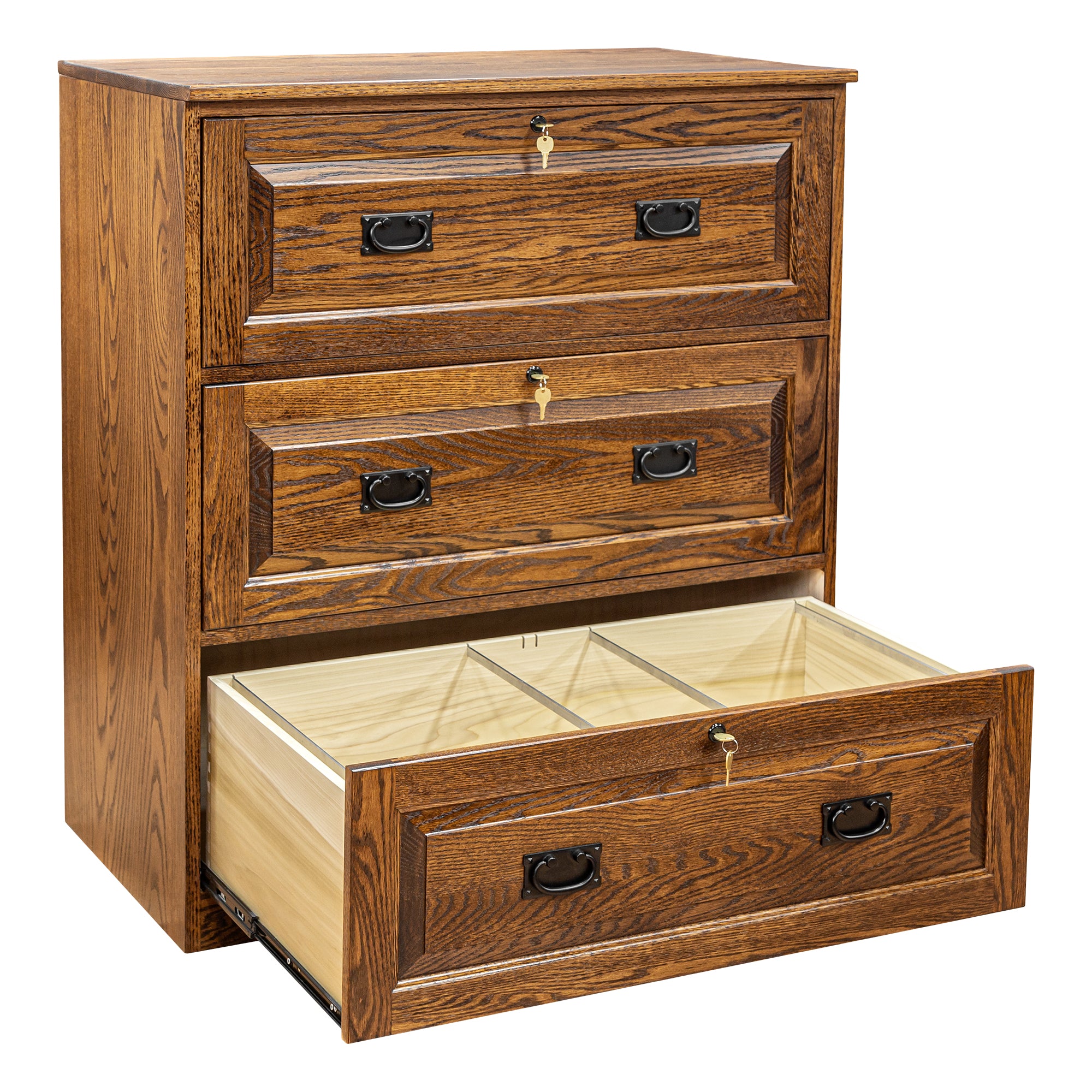 Solid wood furniture made in USAThis beautiful Traditional 3-Drawer Lateral File Cabinet is perfect for keeping your documents protected and organized. This file cabinet is perfect for your office or home and includes many deluxe features: