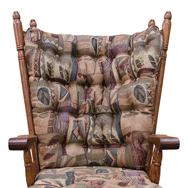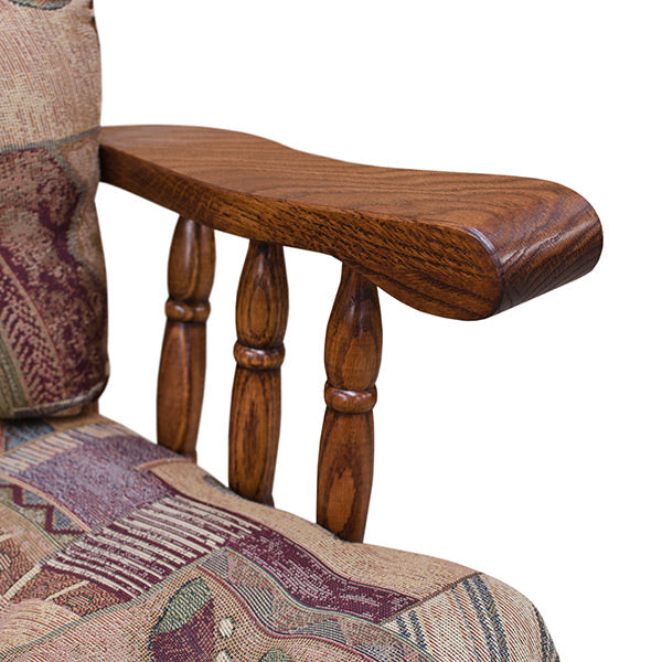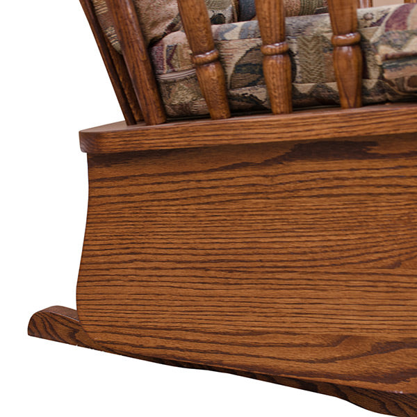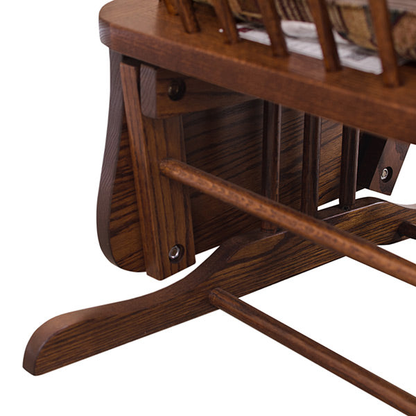 This Traditional Glider Rocker has an eye catching style and sturdy built. Its attractive spindle design and the prominent four thick spindles give this Glider Rocker a unique look. Combine with a beautiful upholstery, this glider rocker is a must have to your living room with the comfort of knowing that this is proudly made in the United States by highly skilled craftsman.