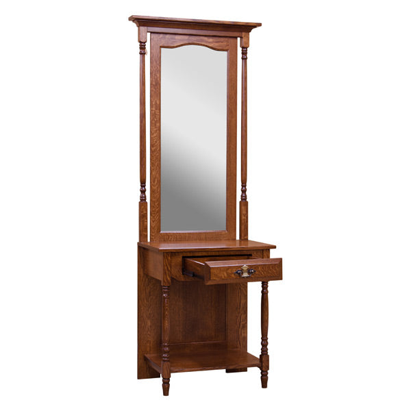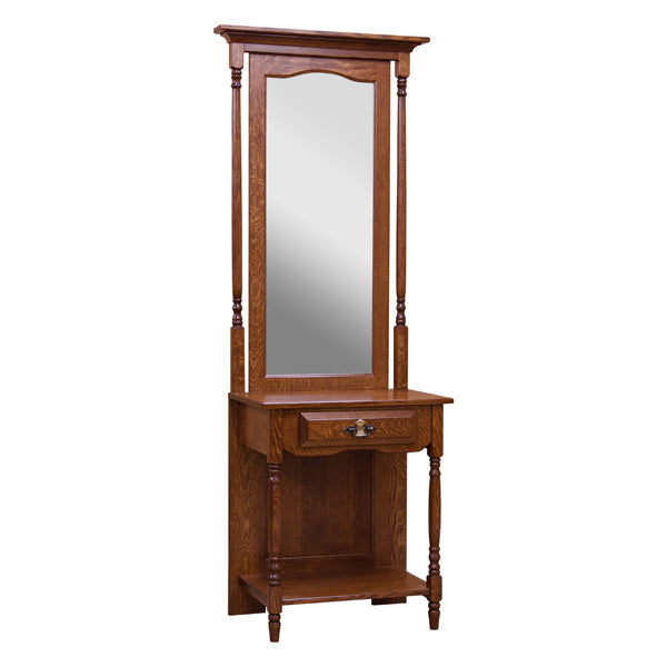 This attractive Traditional Hall Tree display is perfect for the entry way to store small items such as keys and wallets. This hall tree does not have any hooks but it can be added so that you can hang hats, coats and other items. This is a well made item that does not have any veneer or particle board.