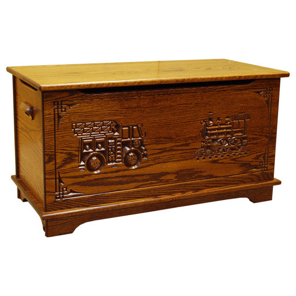 This Amish Toy Box is skillfully constructed in the United States by highly experienced Amish Craftsmen using solid Red Oak (shown). This extraordinary and durable toy box is great for putting away your child?s toys and keeping them safe and organized. In addition, this piece also features two carved toy trucks that will make your child's playroom or bedroom look and feel pleasant.