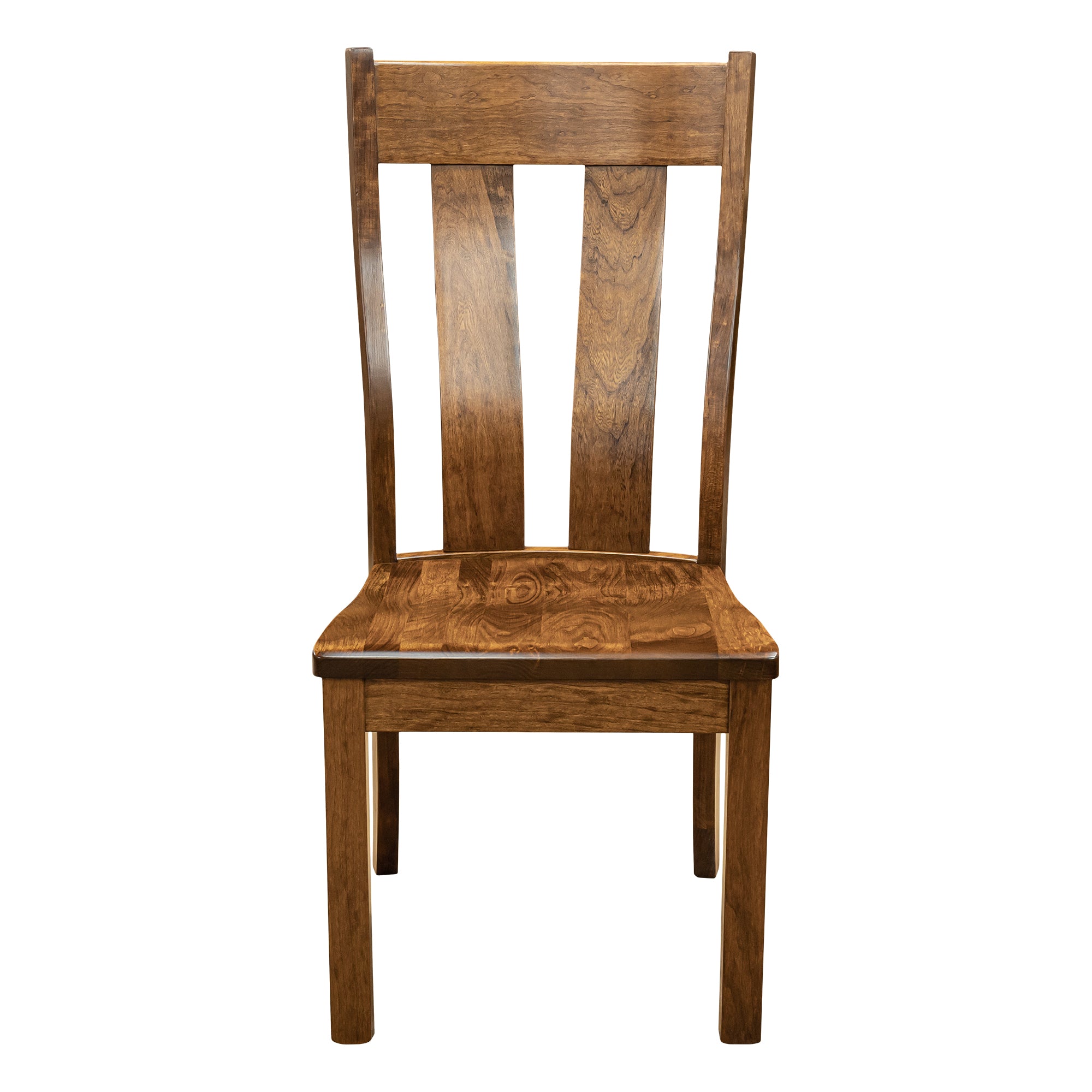 Our new Urbana Side Chair series is shown here handcrafted in Solid Cherry wood. Finish colors include all of the 100s of colors as well as this OCS113 stain. Note the Iron Bolts exposed bracing and tapered trestles. Available in your choice of any wood or color and we have built a full line of matching chairs, dining tables, and china cabinets.