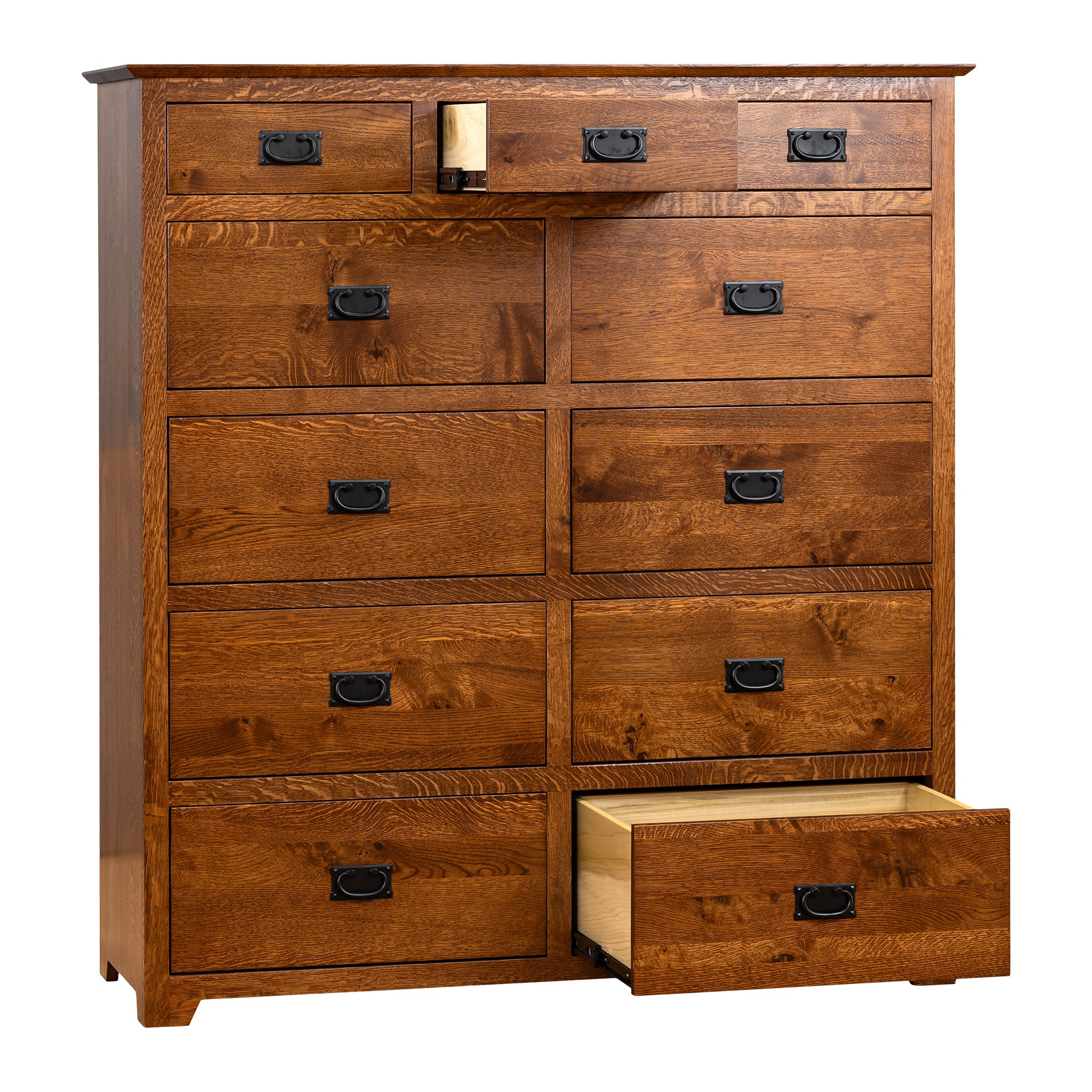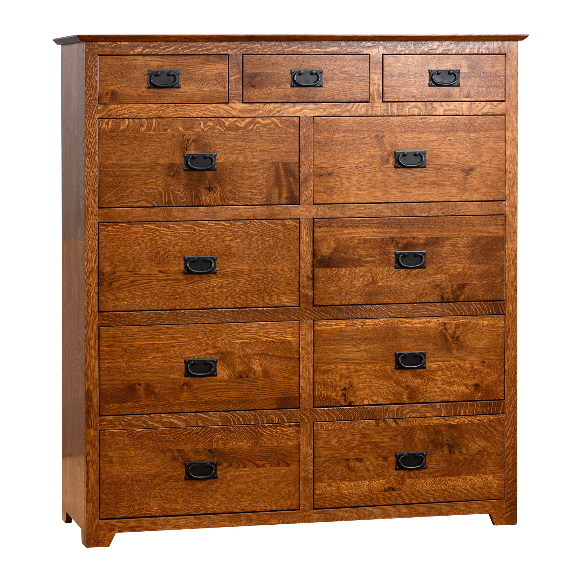 Our distinctive Yancy Cobler (Our Designer) series of dressers and chests have a hint of "Arts and Crafts" and yet "Mid Century" details and materials. Shown here is Solid Rustic White Oak Wood. This series is also available in all Walnut, Cherry, Maple, and Plain Cut Oak, in any finish color. Note the distinctive black mission handles. There are also different hardware alternatives. Shown with an OCS-113 finish.