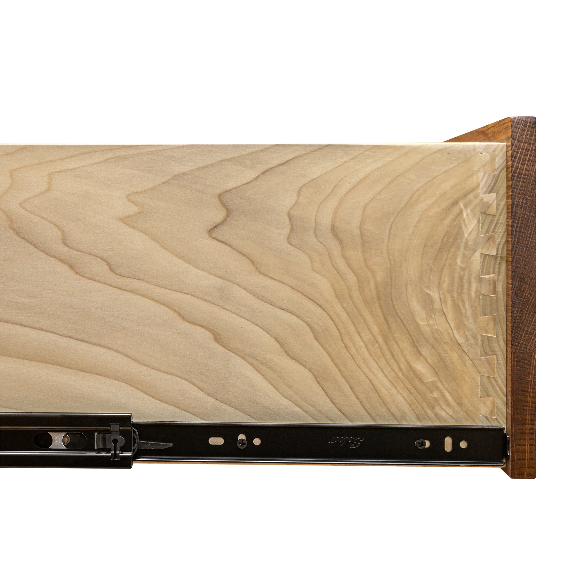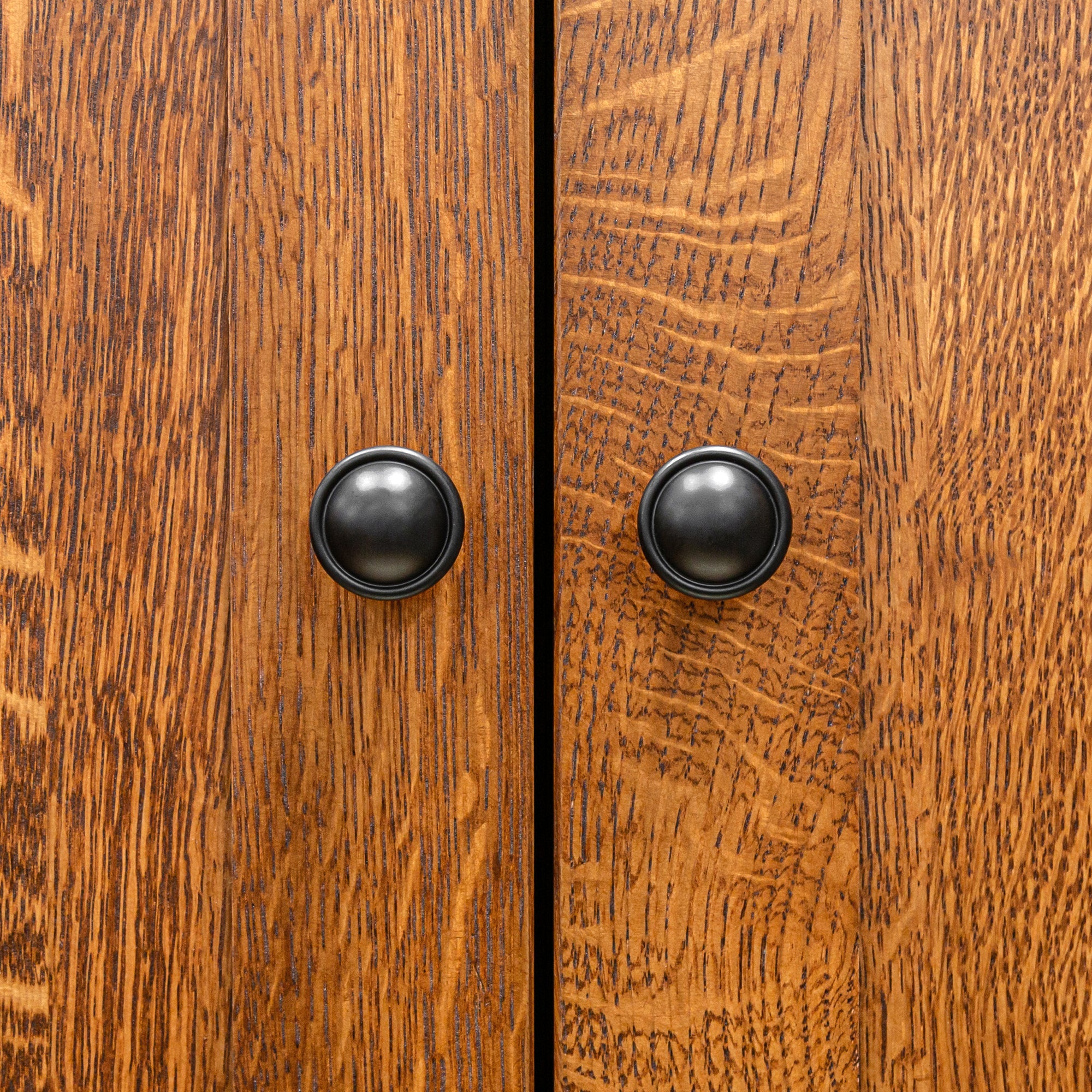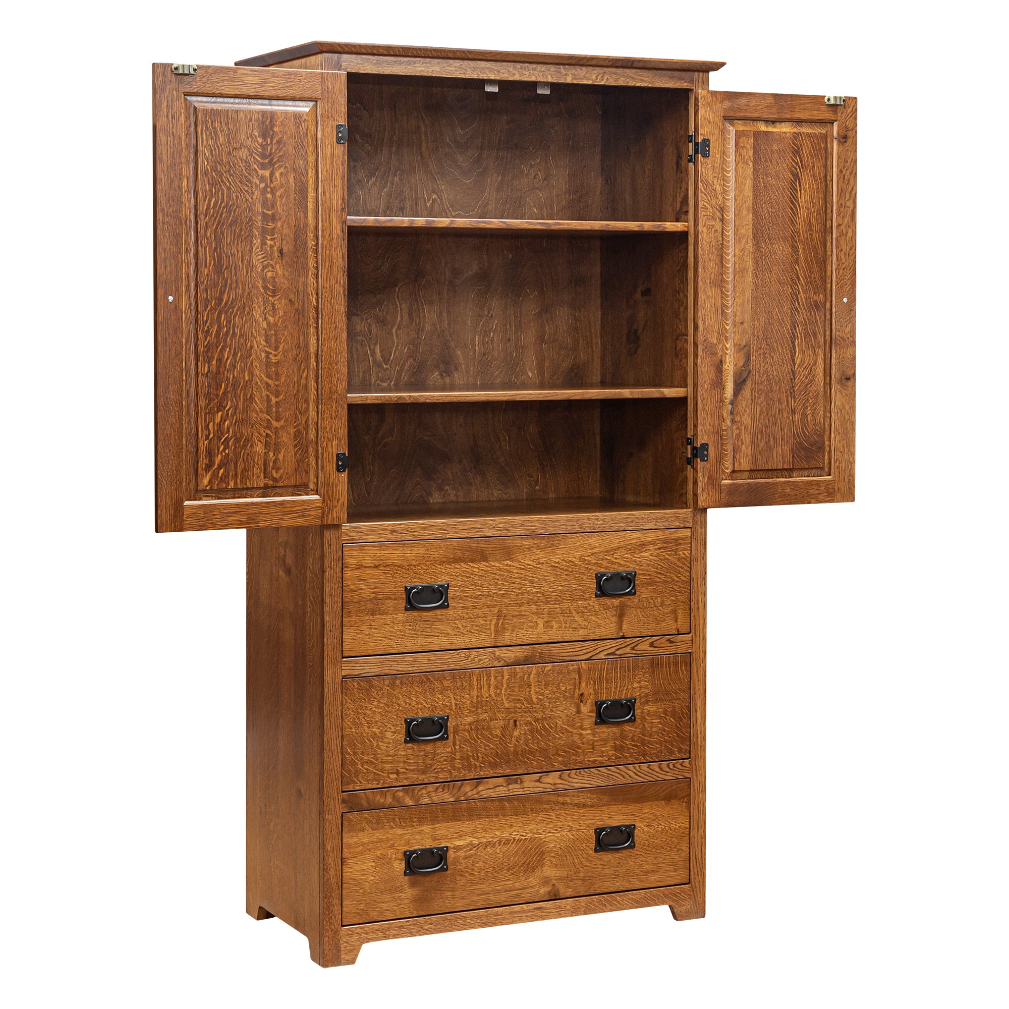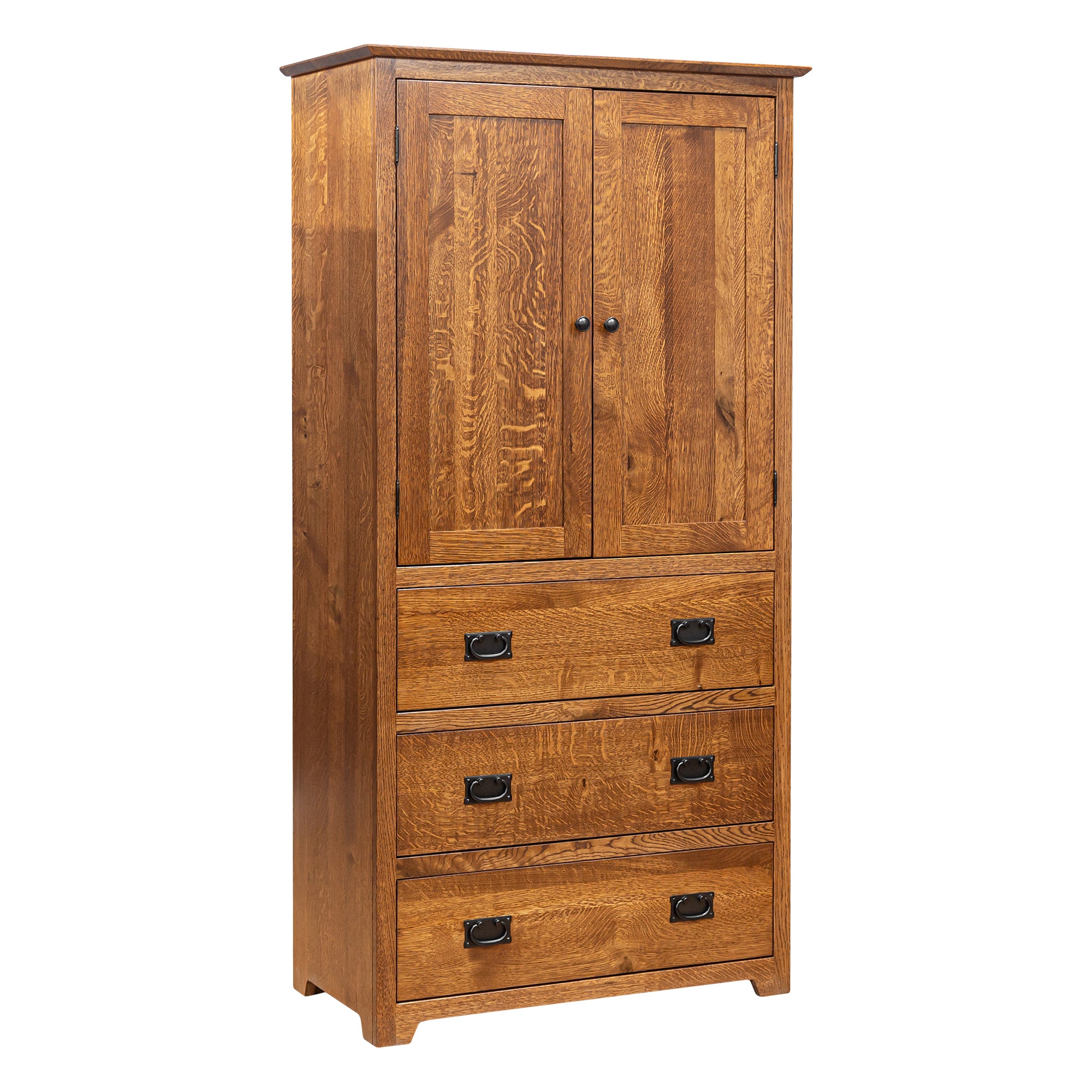 Our distinctive Yancy Cobler (Our Designer) series of dressers and chests have a hint of "Arts and Crafts" and yet "Mid Century" details and materials. Shown here is Solid character QSWO. This particular Armoire with shelves below and hanging pole above was customized to order. Can we build something for you? This series is also available in all Quarter Sawn White Oak, Maple and Red Oak and in any finish color. . There are also different hardware alternatives. Shown with an OCS-113 clear bar-top satin finish.