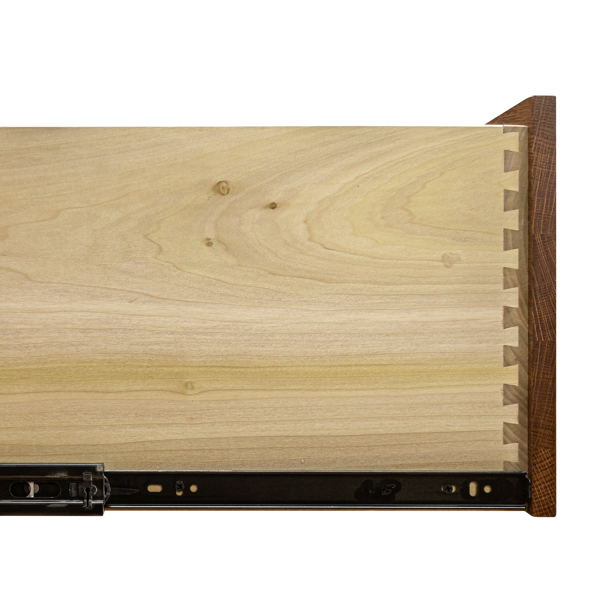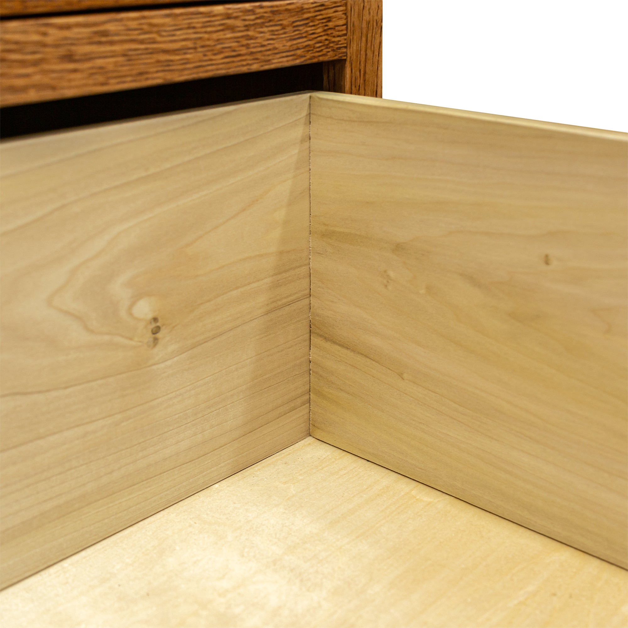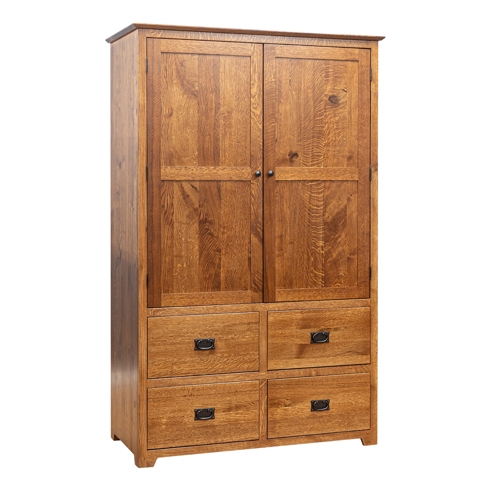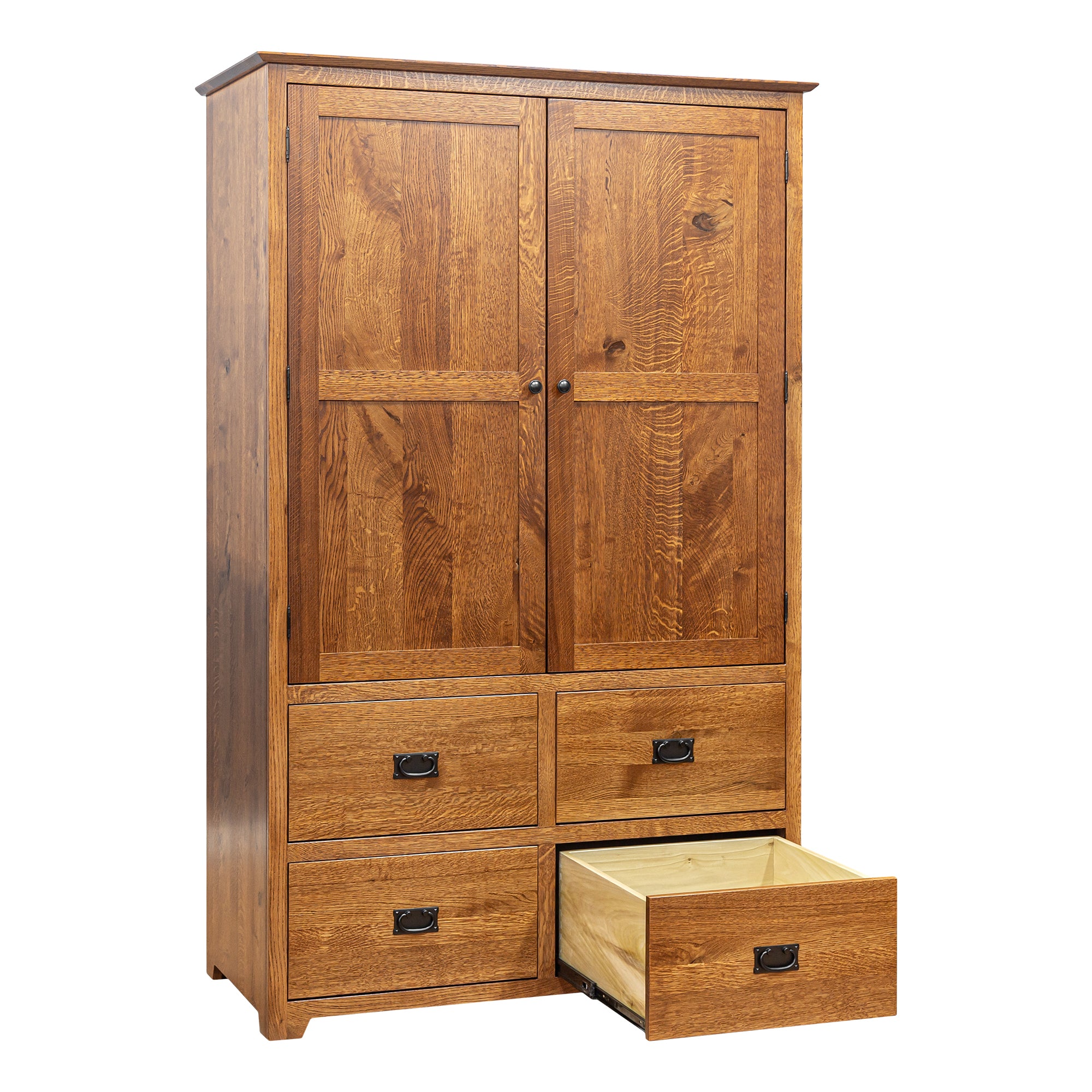 Our distinctive Yancy Cobler (Our Designer) series of dressers and chests have a hint of "Arts and Crafts" and yet "Mid Century" details and materials. Shown here is Solid character QSWO. This particular Armoire with shelves below and hanging pole above was customized to order. Can we build something for you? This series is also available in all Quarter Sawn White Oak, Maple and Red Oak and in any finish color. Note distinctive brushed nickel hardware. There are also different hardware alternatives. Shown with an OCS-100 clear bar-top satin finish.