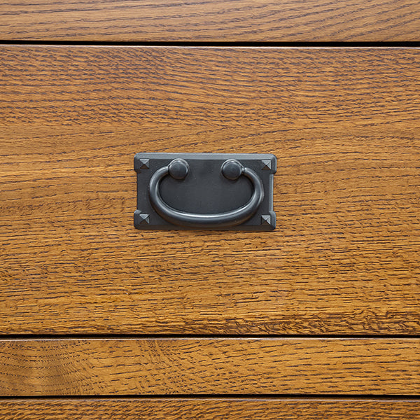 Our distinctive Yancy Cobler (Our Designer) series of dressers and chests have a hint of "Arts and Crafts" and yet "Mid Century" details and materials. Shown here is Solid Character Quarter Sawn Oak Wood. This series is also available in all Walnut, Cherry Oak, Maple and Plain Cut Oak and in any finish color. Note distinctive brushed nickel hardware. There are also different hardware alternatives. Shown with an OCS-113 finish.