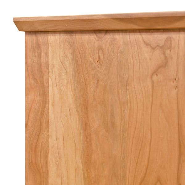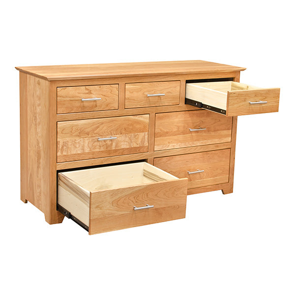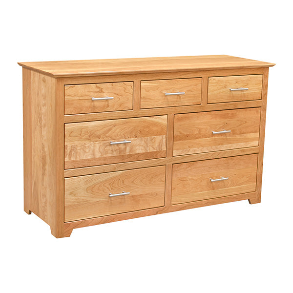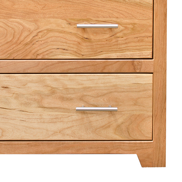 Our distinctive Yancy Cobler (Our Designer) series of dressers and chests have a hint of "Arts and Crafts" and yet "Mid Century" details and materials. Shown here is Solid Pennsylvania Cherry Wood. This series is also available in all Walnut, Quarter Sawn White Oak, Maple and Plain Cut Oak and in any finish color. Note distinctive brushed nickel hardware. There are also different hardware alternatives. Shown with an OCS-101/bar-top satin finish.