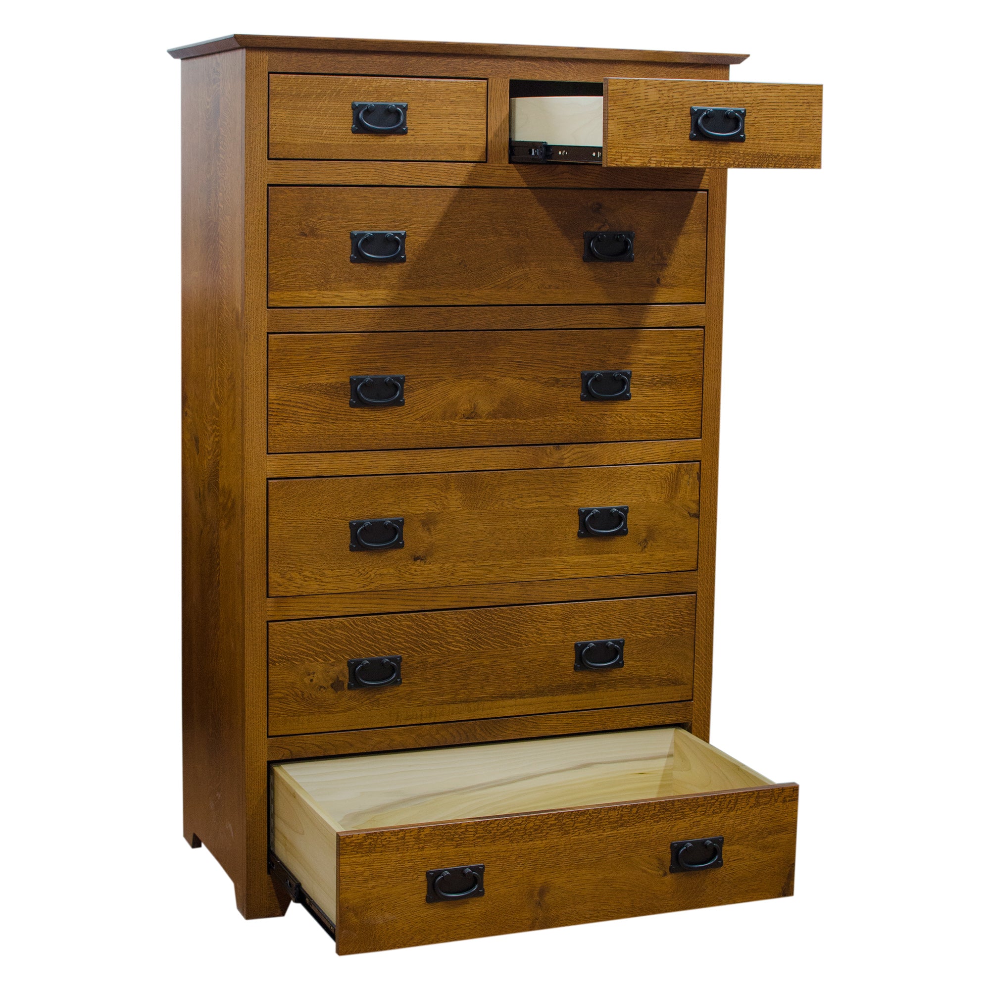 Our distinctive Yancy Cobler (Our Designer) series of dressers and chests have a hint of "Arts and Crafts" and yet "Mid Century" details and materials. Shown here is Solid Rustic White Oak Wood. This series is also available in all Walnut, Cherry, Maple, and Plain Cut Oak, in any finish color.Shown in our standard Black Mission Handles. There are also different hardware alternatives. Shown with an OCS-113 finish.