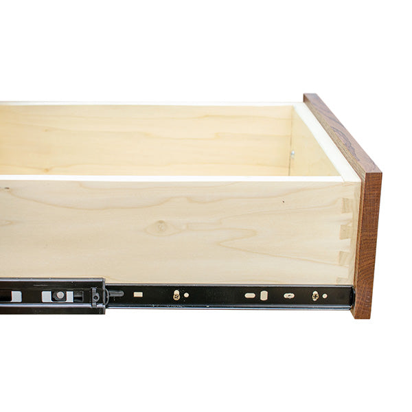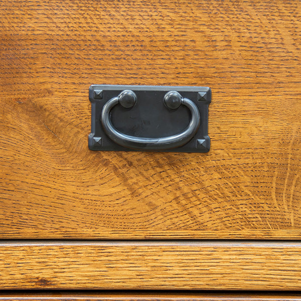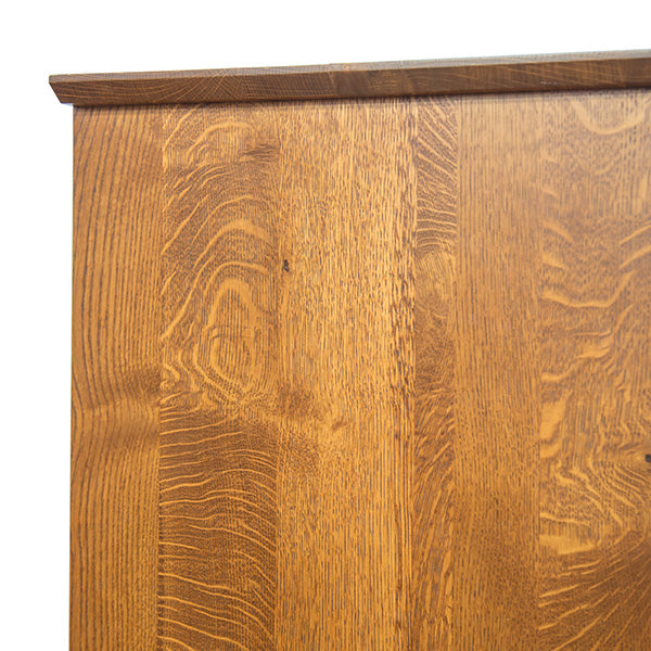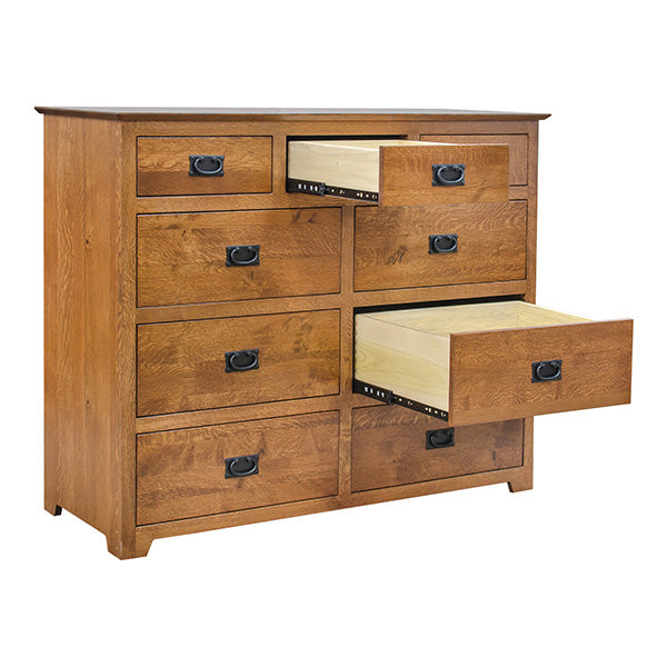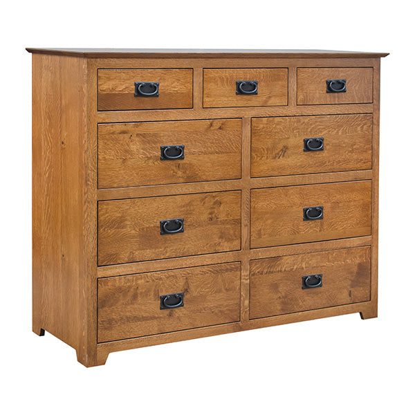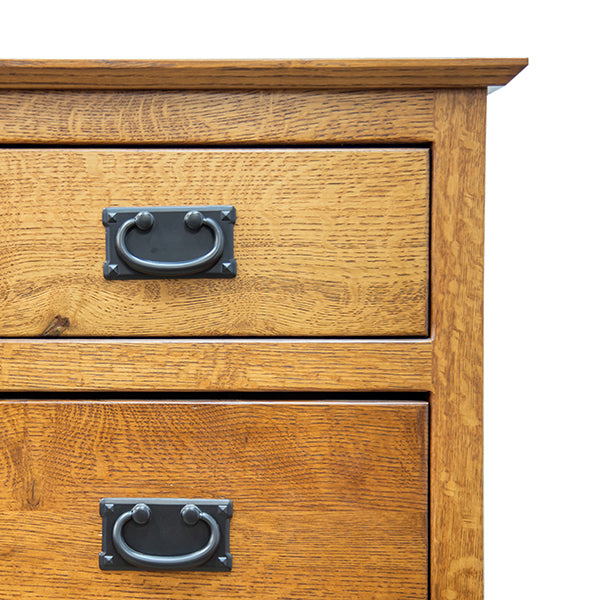 Our distinctive Yancy Cobler (Our Designer) series of dressers and chests have a hint of "Arts and Crafts" and yet "Mid Century" details and materials. Shown here is Solid Rustic White Oak Wood. This series is also available in all Walnut, Cherry, Maple, and Plain Cut Oak, in any finish color. Note the distinctive black mission handles. There are also different hardware alternatives. Shown with an OCS-113 finish.